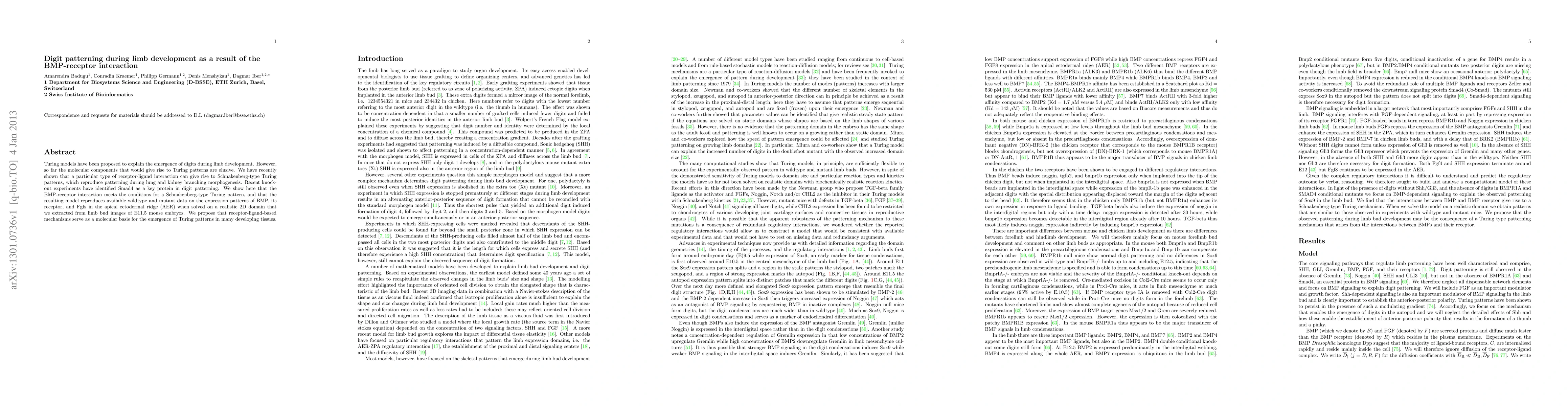 Turing models have been proposed to explain the emergence of digits during limb development. However, so far the molecular components that would give rise to Turing patterns are elusive. We have recently shown that a particular type of receptor-ligand interaction can give rise to Schnakenberg-type Turing patterns, which reproduce patterning during lung and kidney branching morphogenesis. Recent knock-out experiments have identified Smad4 as a key protein in digit patterning. We show here that the BMP-receptor interaction meets the conditions for a Schnakenberg-type Turing pattern, and that the resulting model reproduces available wildtype and mutant data on the expression patterns of BMP, its receptor, and Fgfs in the apical ectodermal ridge (AER) when solved on a realistic 2D domain that we extracted from limb bud images of E11.5 mouse embryos. We propose that receptor-ligand-based mechanisms serve as a molecular basis for the emergence of Turing patterns in many developing tissues.