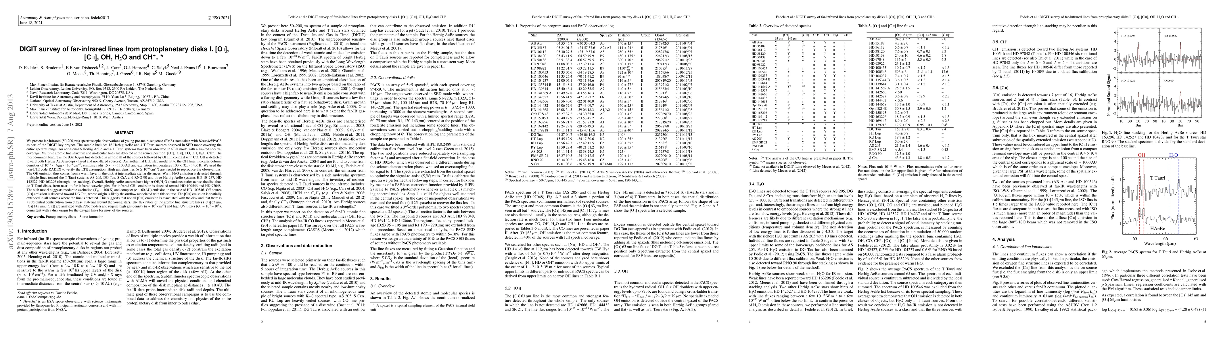 This study uses Herschel/PACS observations to analyze far-infrared lines from protoplanetary disks, detecting OH, H_2O, and [OI] lines in Herbig AeBe and T Tauri stars. OH emission indicates a warm disk layer at intermediate distances, while H_2O is found in both disk types, with Herbig AeBe disks showing higher OH/H_2O ratios. The [CII] emission is spatially extended, suggesting contributions from diffuse material around the stars, not just the disk.