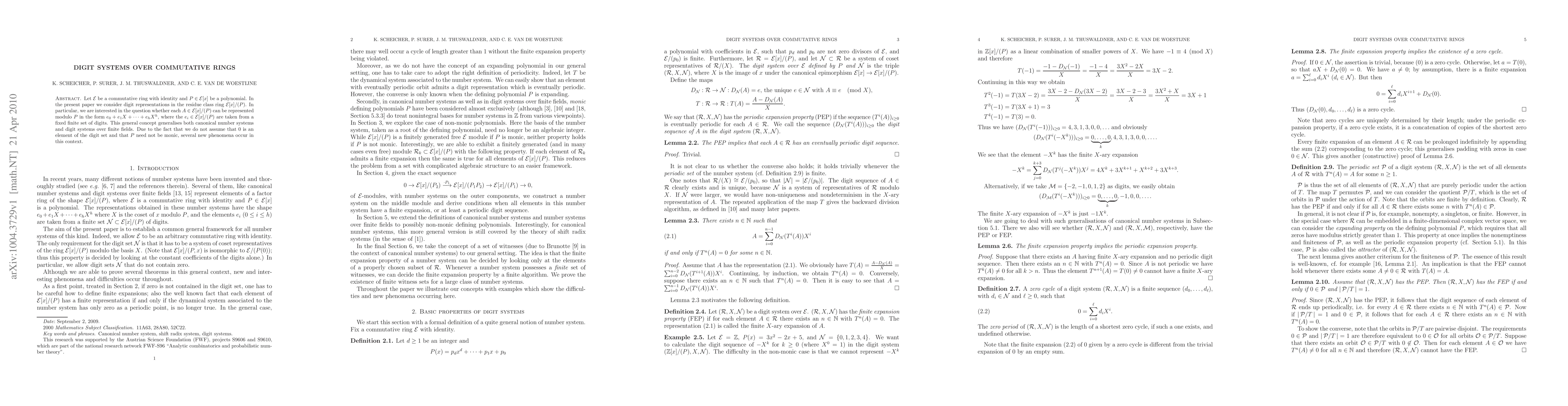 Let $\E$ be a commutative ring with identity and $P\in\E[x]$ be a polynomial. In the present paper we consider digit representations in the residue class ring $\E[x]/(P)$. In particular, we are interested in the question whether each $A\in\E[x]/(P)$ can be represented modulo $P$ in the form $e_0+e_1 X + \cdots + e_h X^h$, where the $e_i\in\E[x]/(P)$ are taken from a fixed finite set of digits. This general concept generalises both canonical number systems and digit systems over finite fields. Due to the fact that we do not assume that $0$ is an element of the digit set and that $P$ need not be monic, several new phenomena occur in this context.