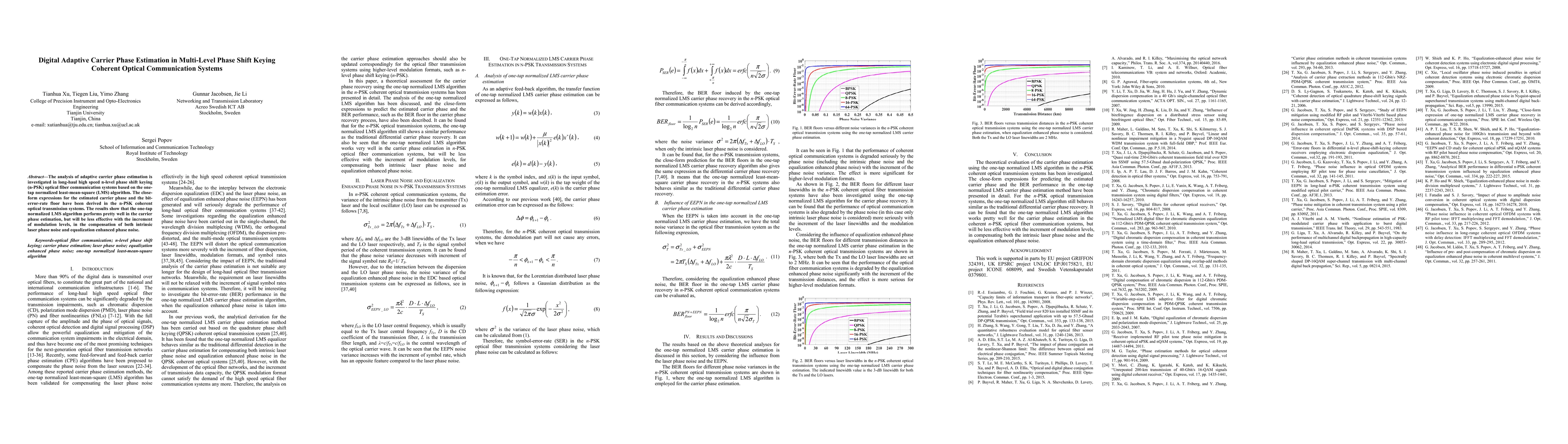 The analysis of adaptive carrier phase estimation is investigated in long-haul high speed n-level phase shift keying (n-PSK) optical fiber communication systems based on the one-tap normalized least-mean-square (LMS) algorithm. The close-form expressions for the estimated carrier phase and the bit-error-rate floor have been derived in the n-PSK coherent optical transmission systems. The results show that the one-tap normalized LMS algorithm performs pretty well in the carrier phase estimation, but will be less effective with the increment of modulation levels, in the compensation of both intrinsic laser phase noise and equalization enhanced phase noise.