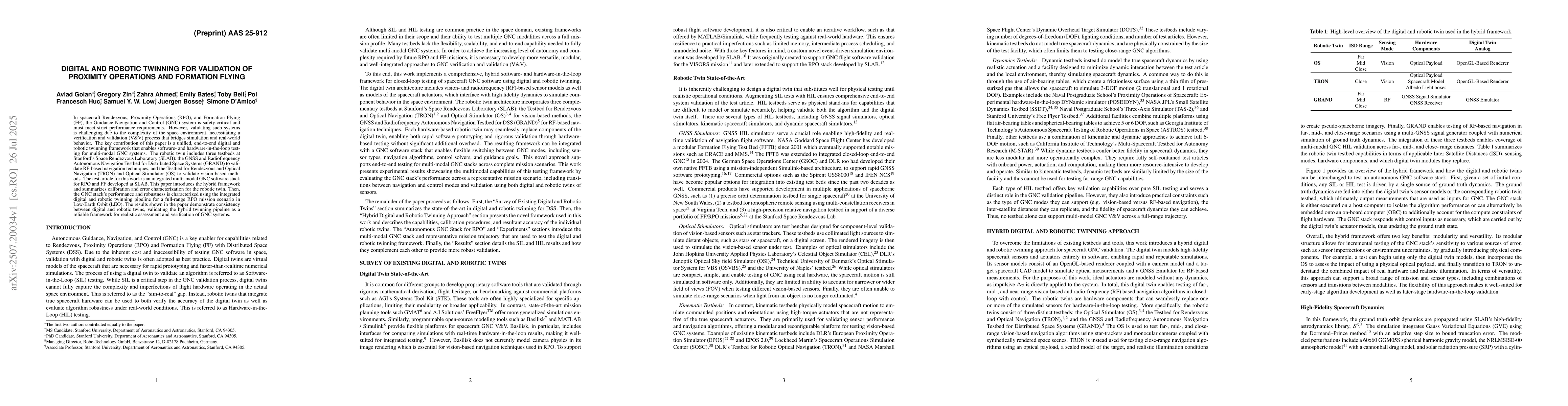 In spacecraft Rendezvous, Proximity Operations (RPO), and Formation Flying (FF), the Guidance Navigation and Control (GNC) system is safety-critical and must meet strict performance requirements. However, validating such systems is challenging due to the complexity of the space environment, necessitating a verification and validation (V&V) process that bridges simulation and real-world behavior. The key contribution of this paper is a unified, end-to-end digital and robotic twinning framework that enables software- and hardware-in-the-loop testing for multi-modal GNC systems. The robotic twin includes three testbeds at Stanford's Space Rendezvous Laboratory (SLAB): the GNSS and Radiofrequency Autonomous Navigation Testbed for Distributed Space Systems (GRAND) to validate RF-based navigation techniques, and the Testbed for Rendezvous and Optical Navigation (TRON) and Optical Stimulator (OS) to validate vision-based methods. The test article for this work is an integrated multi-modal GNC software stack for RPO and FF developed at SLAB. This paper introduces the hybrid framework and summarizes calibration and error characterization for the robotic twin. Then, the GNC stack's performance and robustness is characterized using the integrated digital and robotic twinning pipeline for a full-range RPO mission scenario in Low-Earth Orbit (LEO). The results shown in the paper demonstrate consistency between digital and robotic twins, validating the hybrid twinning pipeline as a reliable framework for realistic assessment and verification of GNC systems.