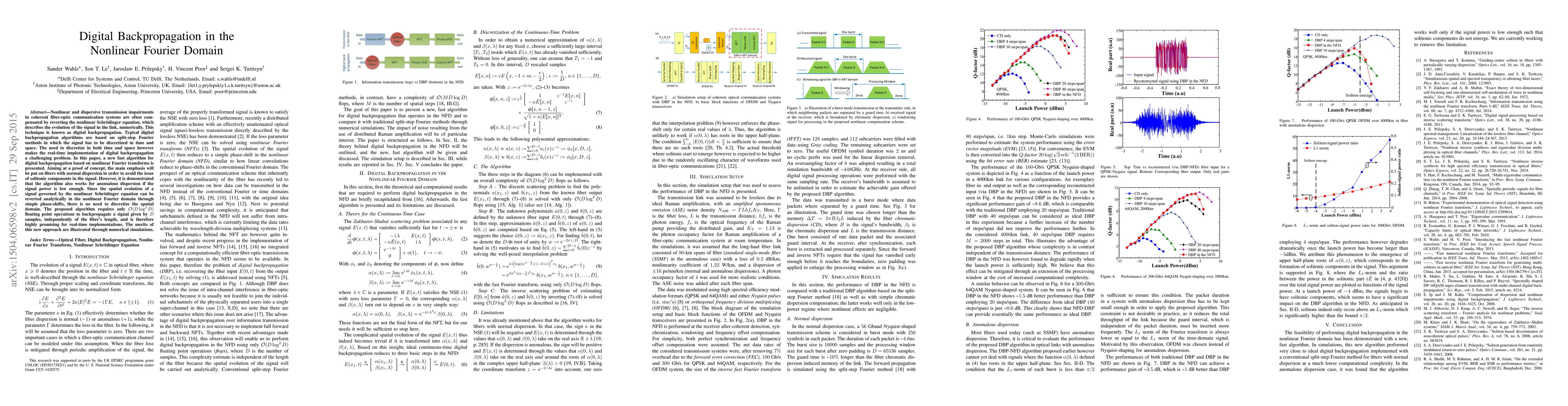 A new algorithm for digital backpropagation in coherent fiber-optic communication systems has been developed, which uses nonlinear Fourier transforms to avoid discretization and requires only O(D log^2 D) floating point operations, making it suitable for real-time implementations.