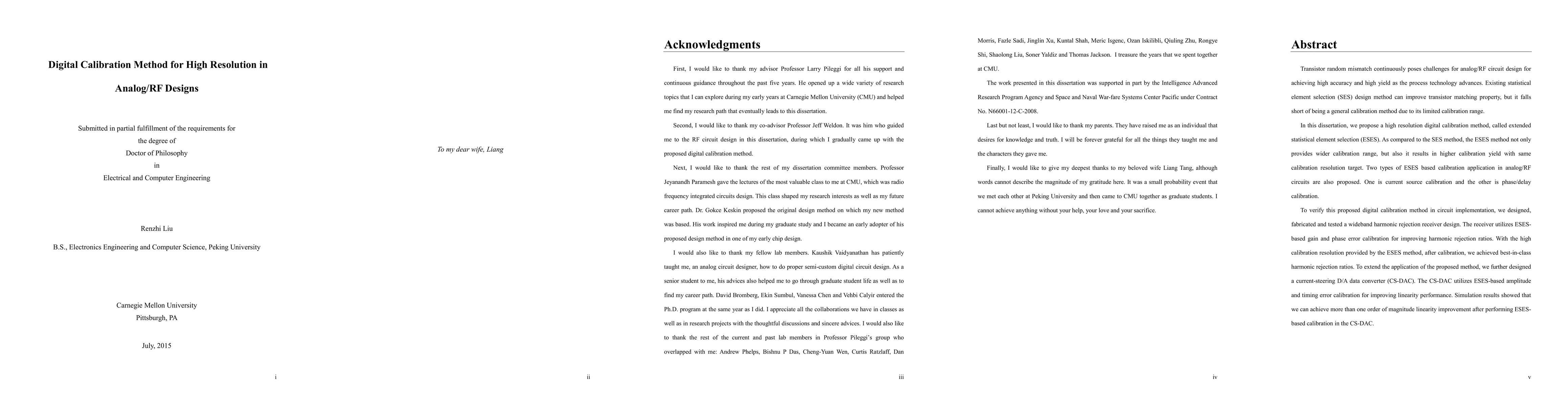 Transistor random mismatch continuously poses challenges for analog/RF circuit design for achieving high accuracy and high yield as the process technology advances. Existing statistical element selection (SES) design method can improve transistor matching property, but it falls short of being a general calibration method due to its limited calibration range. In this dissertation, we propose a high resolution digital calibration method, called extended statistical element selection (ESES). As compared to the SES method, the ESES method not only provides wider calibration range, but also it results in higher calibration yield with same calibration resolution target. Two types of ESES based calibration application in analog/RF circuits are also proposed. One is current source calibration and the other is phase/delay calibration. To verify this proposed digital calibration method in circuit implementation, we designed, fabricated and tested a wideband harmonic rejection receiver design. The receiver utilizes ESES-based gain and phase error calibration for improving harmonic rejection ratios. With the high calibration resolution provided by the ESES method, after calibration, we achieved best-in-class harmonic rejection ratios. To extend the application of the proposed method, we further designed a current-steering D/A data converter (CS-DAC). The CS-DAC utilizes ESES-based amplitude and timing error calibration for improving linearity performance. Simulation results showed that we can achieve more than one order of magnitude linearity improvement after performing ESES-based calibration in the CS-DAC.
