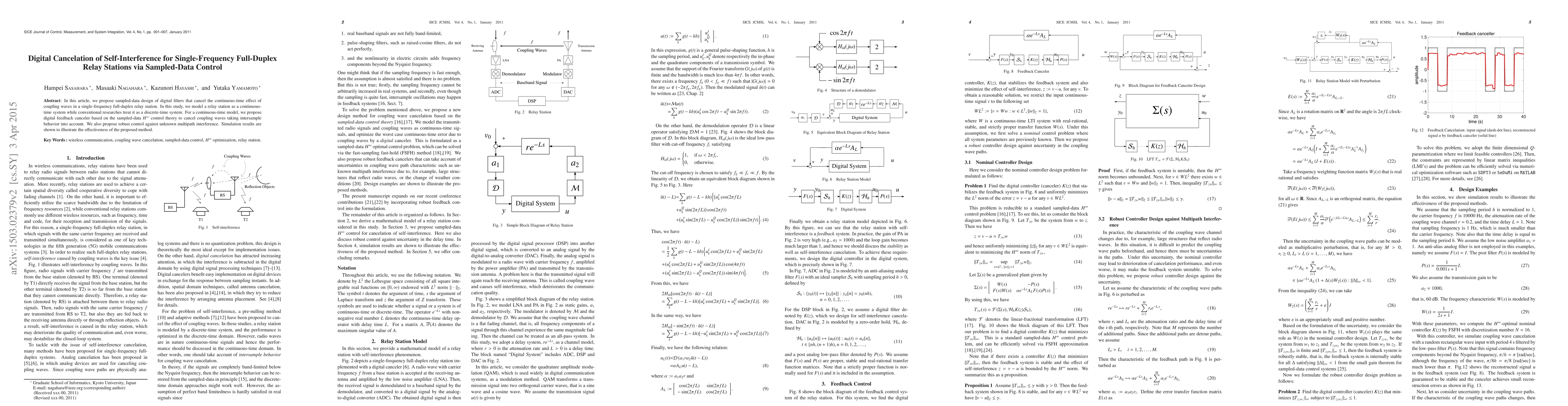 This paper proposes a sampled-data design for digital filters to cancel self-interference in single-frequency full-duplex relay stations, modeling the relay as a continuous-time system. It employs a digital feedback canceler based on H-infinity control theory to address intersample behavior and robustly manage unknown multipath interference.