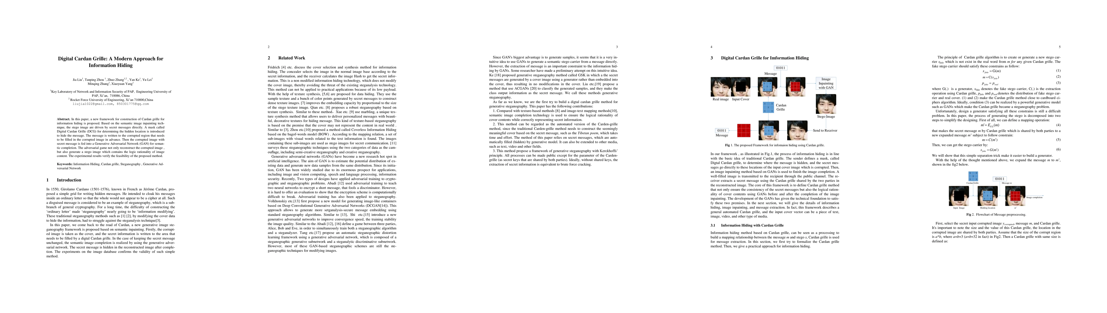 This paper proposes a modern framework for constructing a Cardan grille for information hiding using semantic image inpainting. The Digital Cardan Grille (DCG) hides messages in corrupted image regions, which are then completed using a Generative Adversarial Network (GAN) to produce a stego image that maintains logical image content, verified by experimental results.