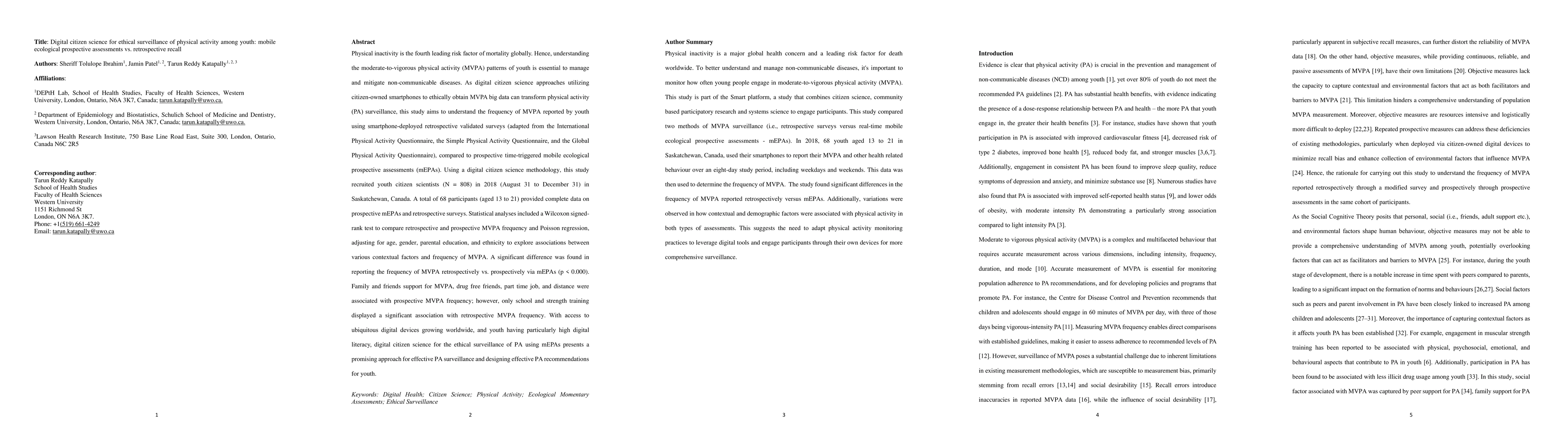 This study compares the frequency of physical activity reported by youth using mobile ecological momentary assessments (mEMAs) versus retrospective surveys, finding significant differences favoring mEMAs. Digital citizen science utilizing smartphones shows promise for ethically obtaining PA data to manage non-communicable diseases.