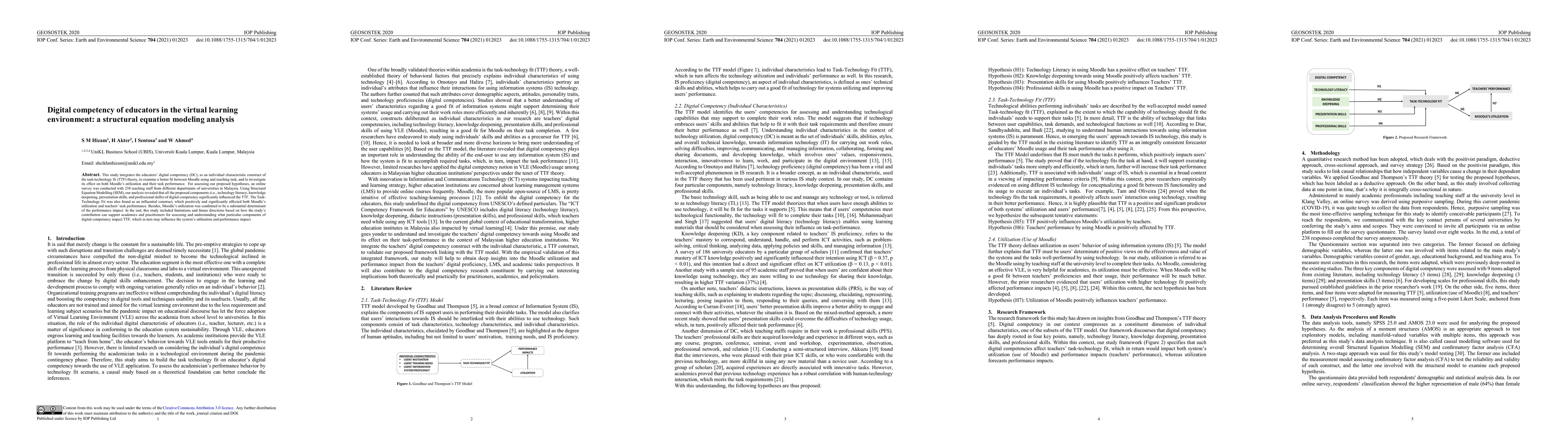 A study of 238 Malaysian educators found that digital competency significantly affects task-technology fit in a virtual learning environment, improving Moodle utilization and teacher performance. Digital competency's components positively impact task-technology fit, which in turn enhances teaching outcomes.