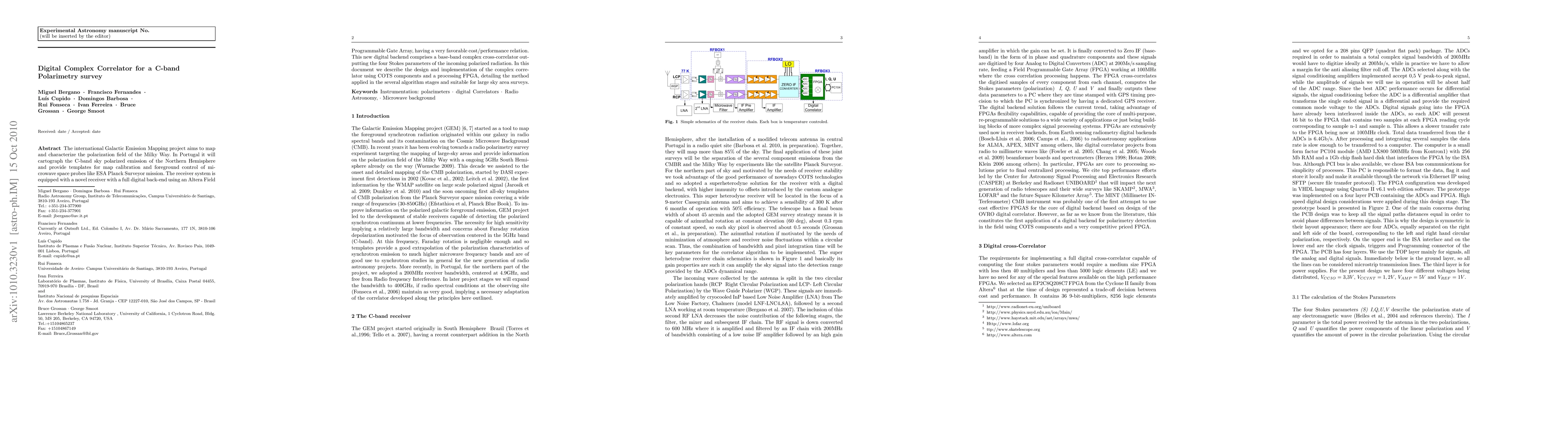 The international Galactic Emission Mapping project aims to map and characterize the polarization field of the Milky Way. In Portugal it will cartograph the C-band sky polarized emission of the Northern Hemisphere and provide templates for map calibration and foreground control of microwave space probes like ESA Planck Surveyor mission. The receiver system is equipped with a novel receiver with a full digital back-end using an Altera Field Programmable Gate Array, having a very favorable cost/performance relation. This new digital backend comprises a base-band complex cross-correlator outputting the four Stokes parameters of the incoming polarized radiation. In this document we describe the design and implementation of the complex correlator using COTS components and a processing FPGA, detailing the method applied in the several algorithm stages and suitable for large sky area surveys.
