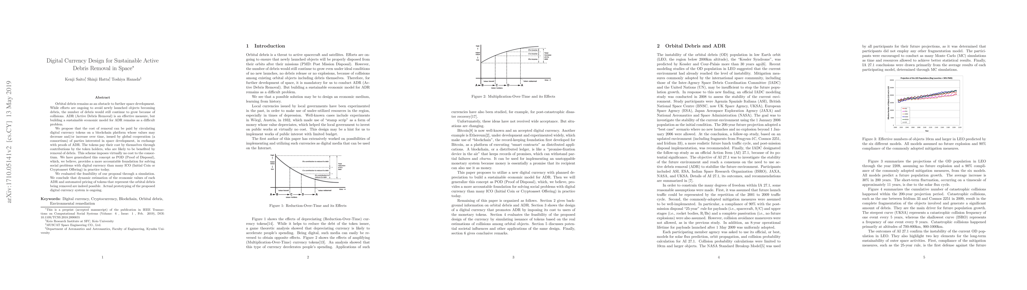 Orbital debris remains as an obstacle to further space development. While efforts are ongoing to avoid newly launched objects becoming debris, the number of debris would still continue to grow because of collisions. ADR (Active Debris Removal) is an effective measure, but building a sustainable economic model for ADR remains as a difficult problem. We propose that the cost of removal can be paid by circulating digital currency tokens on a blockchain platform whose values may decrease and/or increase over time, issued by global cooperation (a consortium) of parties interested in space development, in exchange with proofs of ADR. The tokens pay their cost by themselves through contributions by the token holders, who are likely to be benefited by removal of debris. This scheme imposes virtually no cost to the consortium. We have generalized this concept as POD (Proof of Disposal), which, we believe, provides a more accountable foundation for solving social problems with digital currency than many ICO (Initial Coin or Cryptoasset Offering) in practice today. We evaluated the feasibility of our proposal through a simulation. We conclude that dynamic estimation of the economic values of each ADR and automated pricing of tokens that represent the orbital debris being removed are indeed possible. Actual prototyping of the proposed digital currency system is ongoing.