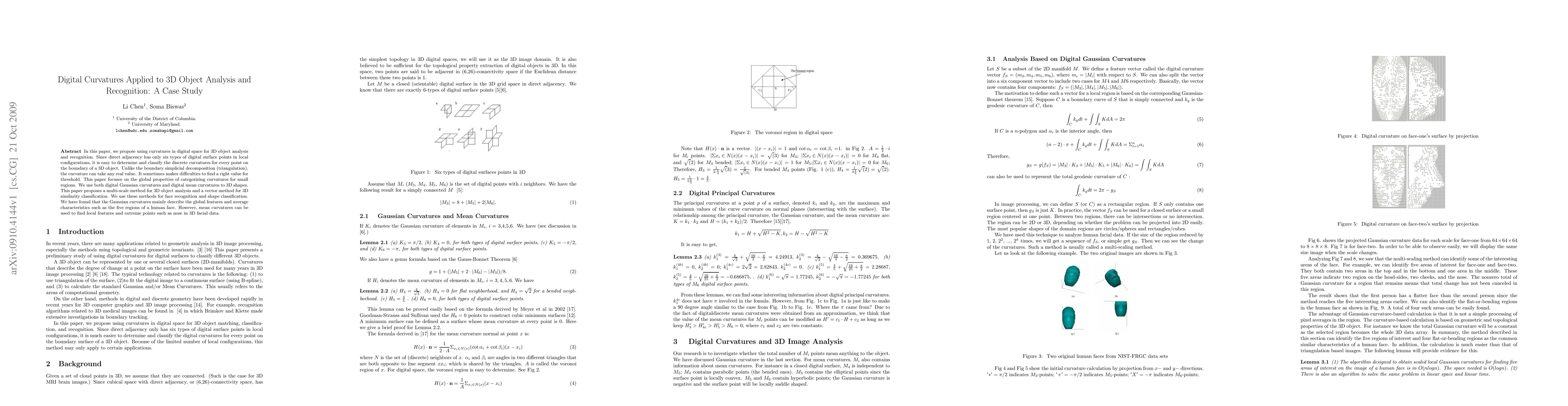 In this paper, we propose using curvatures in digital space for 3D object analysis and recognition. Since direct adjacency has only six types of digital surface points in local configurations, it is easy to determine and classify the discrete curvatures for every point on the boundary of a 3D object. Unlike the boundary simplicial decomposition (triangulation), the curvature can take any real value. It sometimes makes difficulties to find a right value for threshold. This paper focuses on the global properties of categorizing curvatures for small regions. We use both digital Gaussian curvatures and digital mean curvatures to 3D shapes. This paper proposes a multi-scale method for 3D object analysis and a vector method for 3D similarity classification. We use these methods for face recognition and shape classification. We have found that the Gaussian curvatures mainly describe the global features and average characteristics such as the five regions of a human face. However, mean curvatures can be used to find local features and extreme points such as nose in 3D facial data.