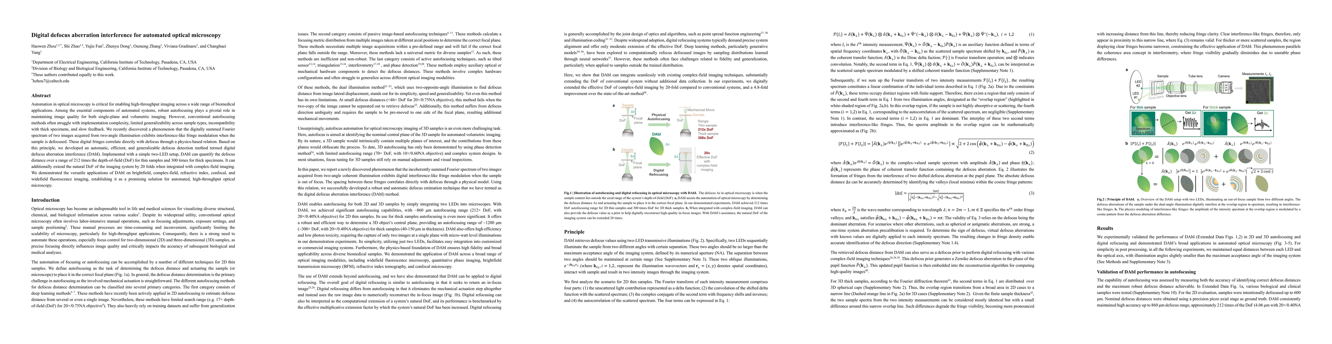 Automation in optical microscopy is critical for enabling high-throughput imaging across a wide range of biomedical applications. Among the essential components of automated systems, robust autofocusing plays a pivotal role in maintaining image quality for both single-plane and volumetric imaging. However, conventional autofocusing methods often struggle with implementation complexity, limited generalizability across sample types, incompatibility with thick specimens, and slow feedback. We recently discovered a phenomenon that the digitally summed Fourier spectrum of two images acquired from two-angle illumination exhibits interference-like fringe modulation when the sample is defocused. These digital fringes correlate directly with defocus through a physics-based relation. Based on this principle, we developed an automatic, efficient, and generalizable defocus detection method termed digital defocus aberration interference (DAbI). Implemented with a simple two-LED setup, DAbI can quantify the defocus distance over a range of 212 times the depth-of-field (DoF) for thin samples and 300 times for thick specimens. It can additionally extend the natural DoF of the imaging system by 20 folds when integrated with complex-field imaging. We demonstrated the versatile applications of DAbI on brightfield, complex-field, refractive index, confocal, and widefield fluorescence imaging, establishing it as a promising solution for automated, high-throughput optical microscopy.