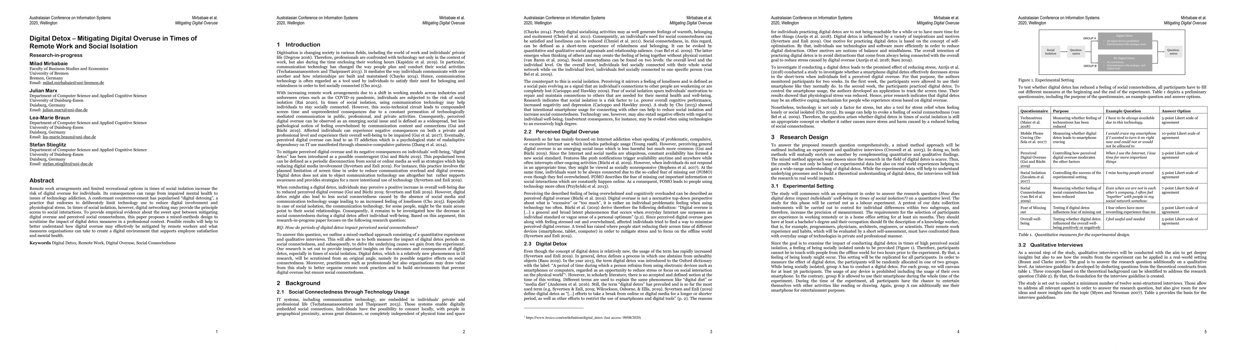 Remote work arrangements and limited recreational options in times of social isolation increase the risk of digital overuse for individuals. Its consequences can range from impaired mental health to issues of technology addiction. A conformant countermovement has popularised digital detoxing, a practice that endorses to deliberately limit technology use to reduce digital involvement and physiological stress. In times of social isolation, however, digital networking may provide the principle access to social interactions. To provide empirical evidence about the sweet spot between mitigating digital overuse and perceived social connectedness, this paper proposes a mixed-methods design to scrutinise the impact of digital detox measures in a professional context. Possible results will help to better understand how digital overuse may effectively be mitigated by remote workers and what measures organisations can take to create a digital environment that supports employee satisfaction and mental health.