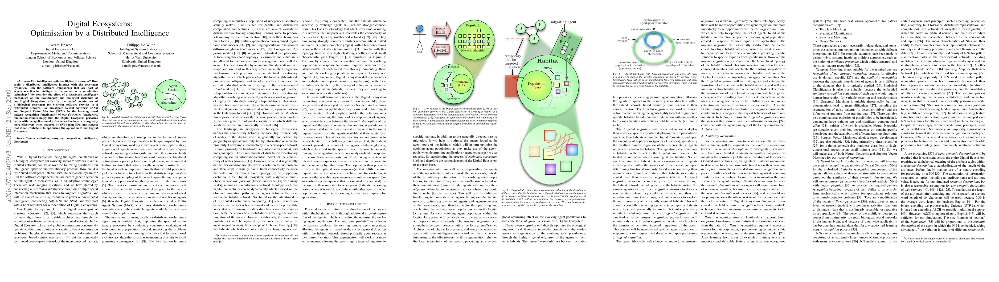 Can intelligence optimise Digital Ecosystems? How could a distributed intelligence interact with the ecosystem dynamics? Can the software components that are part of genetic selection be intelligent in themselves, as in an adaptive technology? We consider the effect of a distributed intelligence mechanism on the evolutionary and ecological dynamics of our Digital Ecosystem, which is the digital counterpart of a biological ecosystem for evolving software services in a distributed network. We investigate Neural Networks and Support Vector Machine for the learning based pattern recognition functionality of our distributed intelligence. Simulation results imply that the Digital Ecosystem performs better with the application of a distributed intelligence, marginally more effectively when powered by Support Vector Machine than Neural Networks, and suggest that it can contribute to optimising the operation of our Digital Ecosystem.