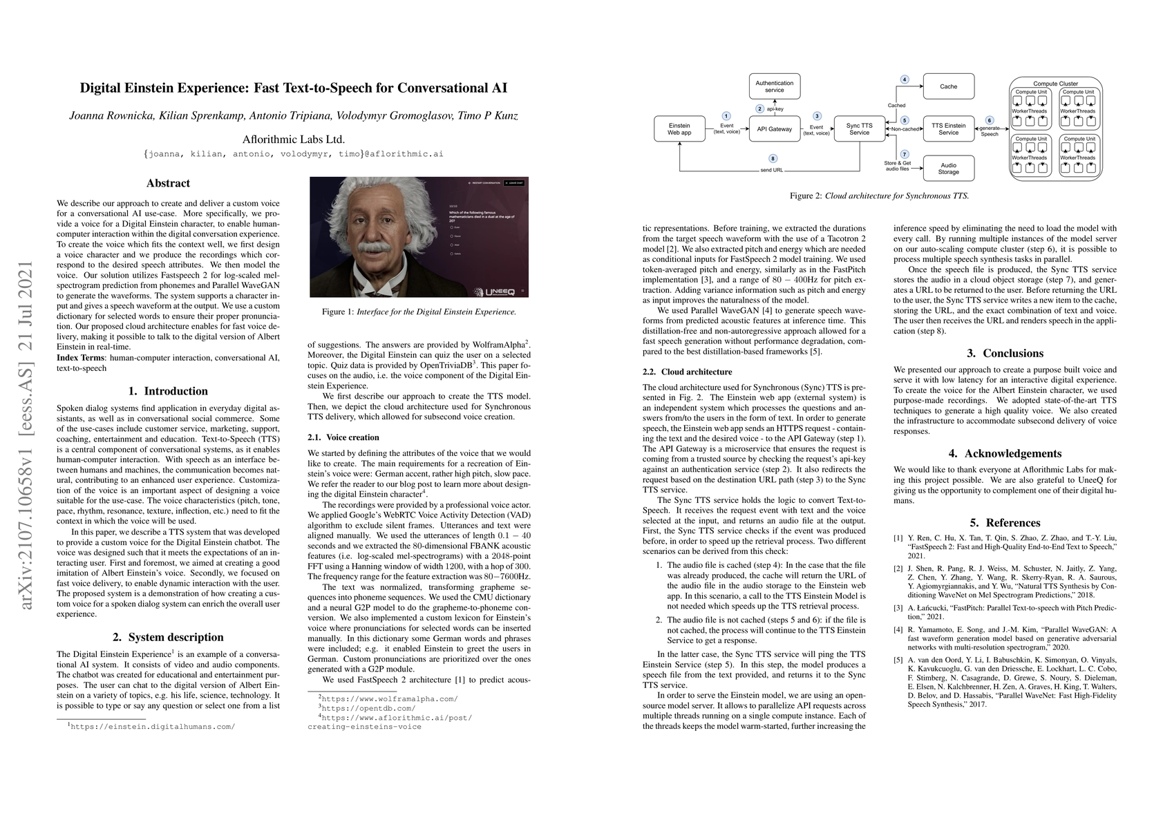 We describe our approach to create and deliver a custom voice for a conversational AI use-case. More specifically, we provide a voice for a Digital Einstein character, to enable human-computer interaction within the digital conversation experience. To create the voice which fits the context well, we first design a voice character and we produce the recordings which correspond to the desired speech attributes. We then model the voice. Our solution utilizes Fastspeech 2 for log-scaled mel-spectrogram prediction from phonemes and Parallel WaveGAN to generate the waveforms. The system supports a character input and gives a speech waveform at the output. We use a custom dictionary for selected words to ensure their proper pronunciation. Our proposed cloud architecture enables for fast voice delivery, making it possible to talk to the digital version of Albert Einstein in real-time.