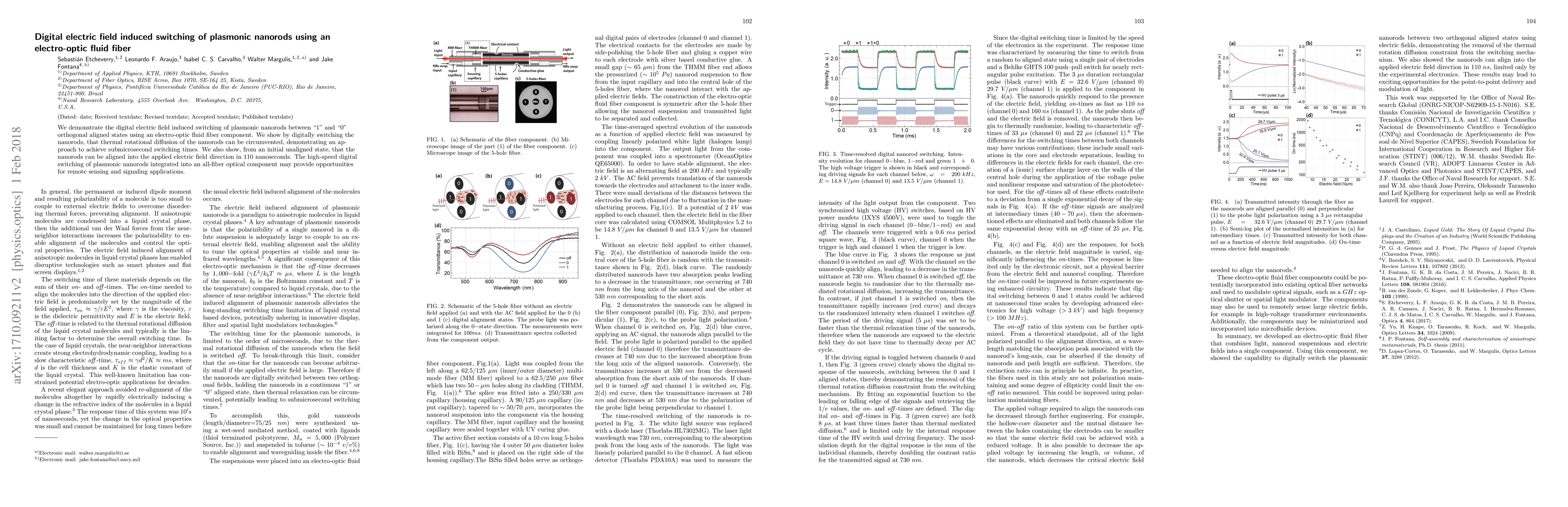 This paper demonstrates digital electric field-induced switching of plasmonic nanorods using an electro-optic fluid fiber, achieving submicrosecond switching times and aligning nanorods in 110 nanoseconds, potentially enabling novel remote sensing and signaling applications.
