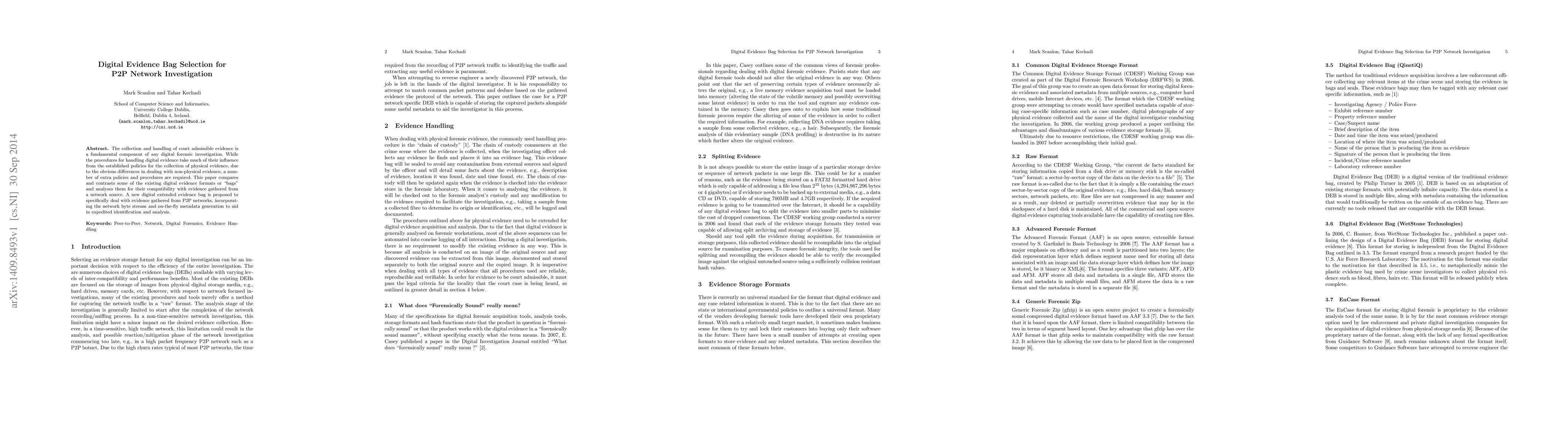 The collection and handling of court admissible evidence is a fundamental component of any digital forensic investigation. While the procedures for handling digital evidence take much of their influence from the established policies for the collection of physical evidence, due to the obvious differences in dealing with non-physical evidence, a number of extra policies and procedures are required. This paper compares and contrasts some of the existing digital evidence formats or "bags" and analyses them for their compatibility with evidence gathered from a network source. A new digital extended evidence bag is proposed to specifically deal with evidence gathered from P2P networks, incorporating the network byte stream and on-the-fly metadata generation to aid in expedited identification and analysis.
