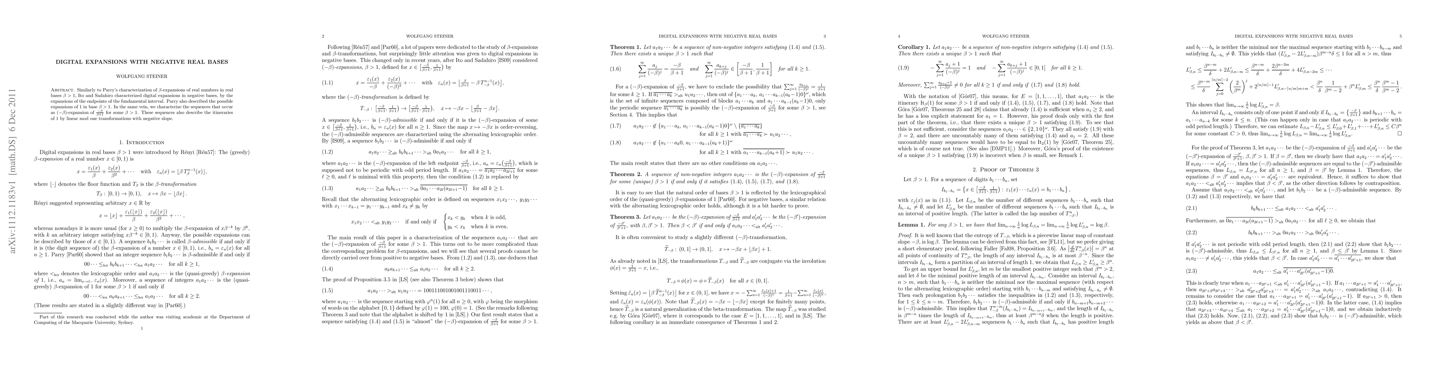 This paper characterizes digital expansions in negative bases, specifically focusing on the $(-\beta)$-expansion of $\frac{-\beta}{\beta+1}$ for $\beta > 1$, and connects these sequences to the itineraries of 1 under linear mod one transformations with negative slopes.