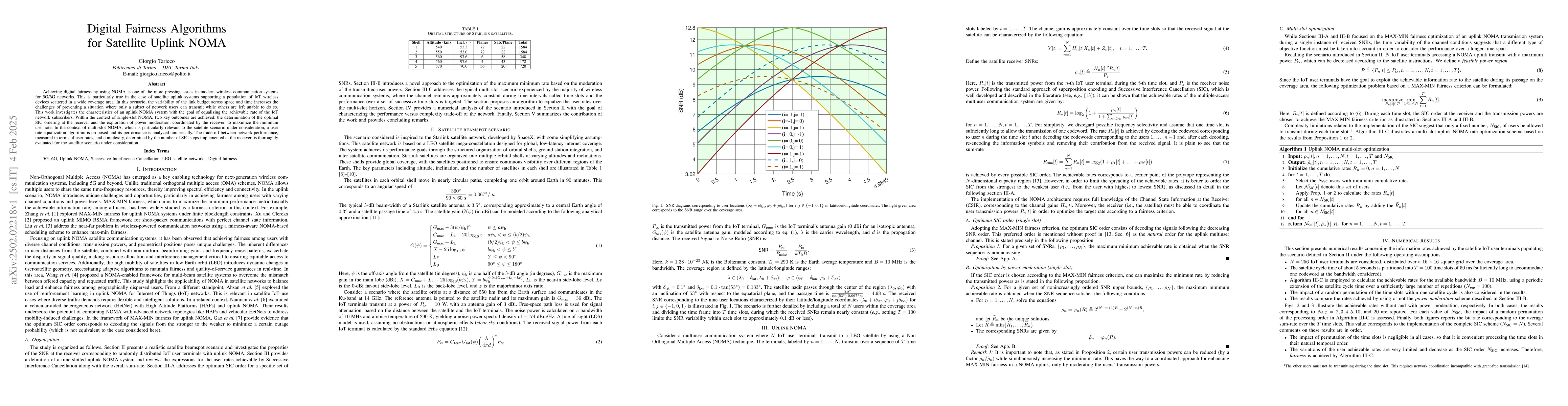 The paper presents novel algorithms and analysis for achieving digital fairness in satellite uplink NOMA systems, including optimal SIC ordering, power moderation, and a user rate equalization algorithm for multi-slot NOMA.