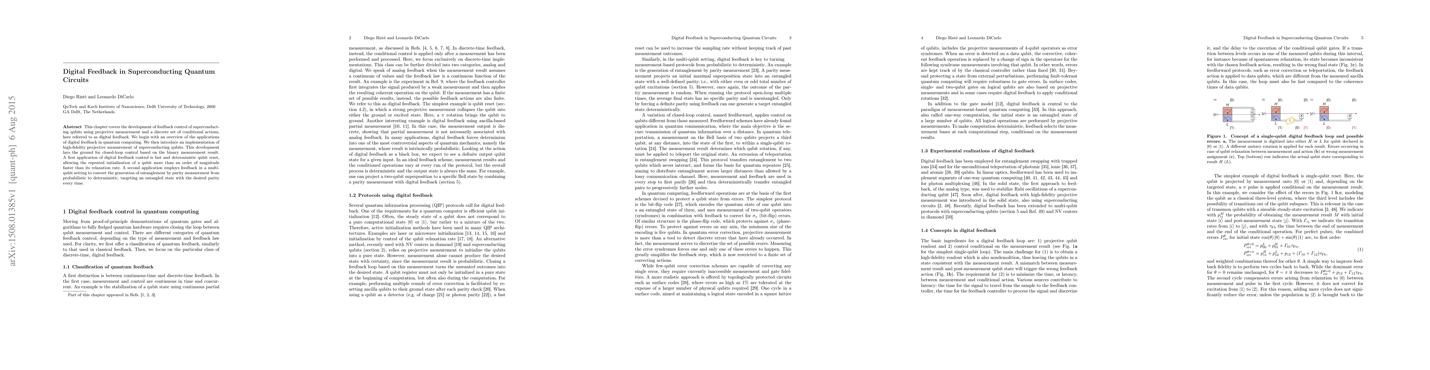 This paper explores the implementation of digital feedback in superconducting quantum circuits, focusing on high-fidelity projective measurement and its applications in qubit reset and deterministic entanglement generation. The method enables faster qubit initialization and reliable multi-qubit entanglement.
