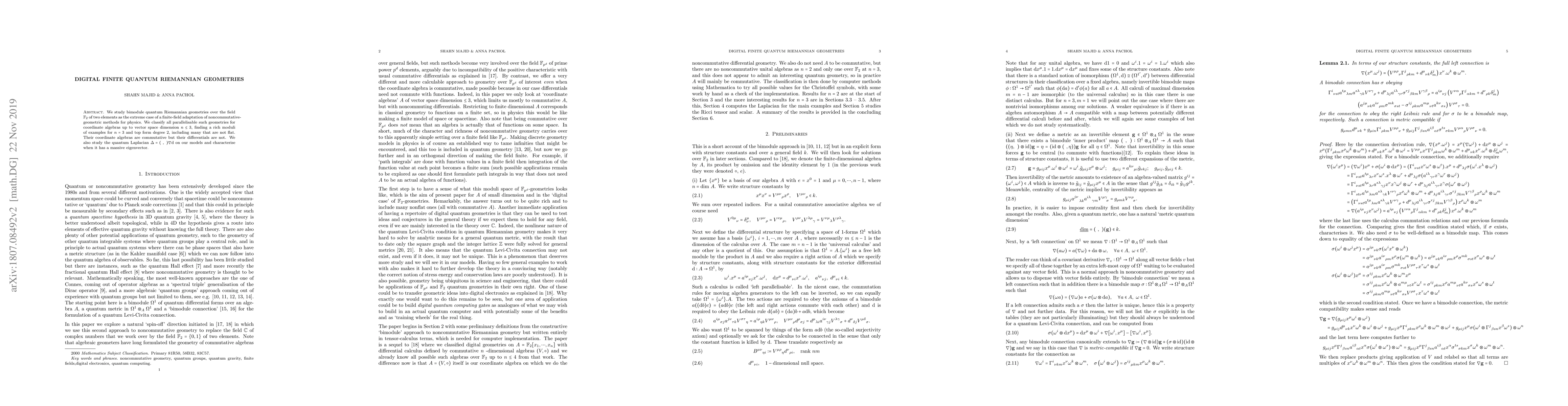 Researchers studied digital finite quantum Riemannian geometries over a 2-element field, classifying parallelisable geometries up to dimension 3 and finding many non-flat examples with commutative coordinate algebras but non-commutative differentials.