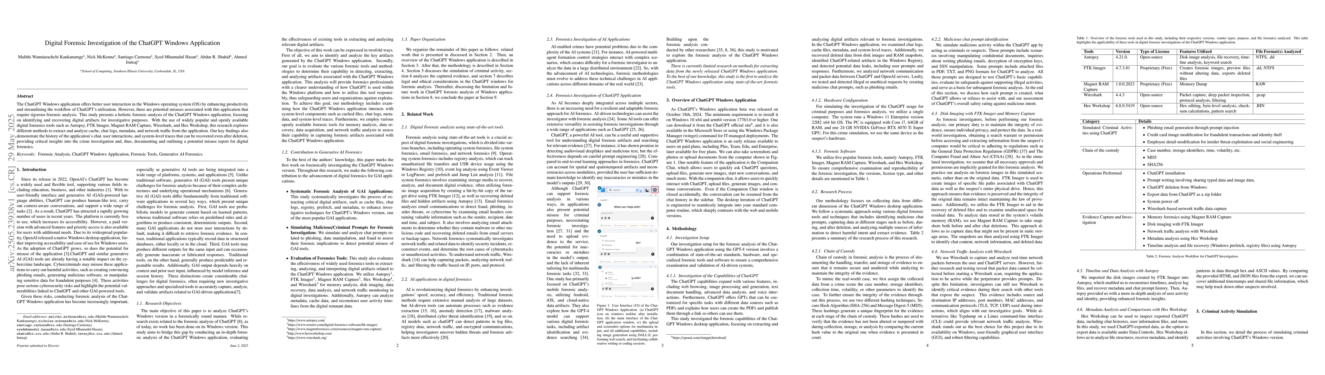 This study examines the ChatGPT Windows application through a digital forensic analysis, focusing on recovering artifacts like chat logs and network traffic for crime investigation purposes. The research provides critical insights into potential misuse of the application by documenting its history and system-level traces that can be recovered even after deletion.