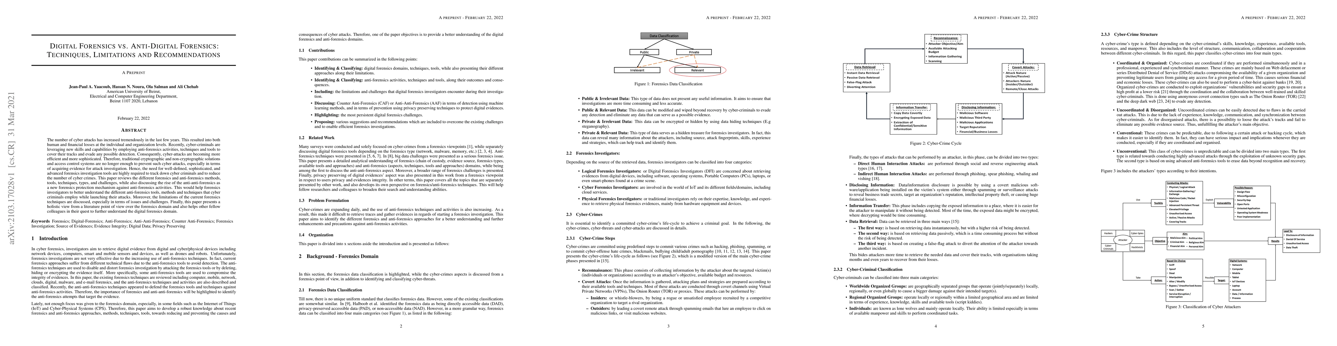 This paper reviews digital forensics and anti-forensics techniques, highlighting the rise of sophisticated cyber-attacks and the corresponding need for advanced forensic tools. It also discusses the limitations of current forensic methods and introduces anti-anti-forensics as a countermeasure.
