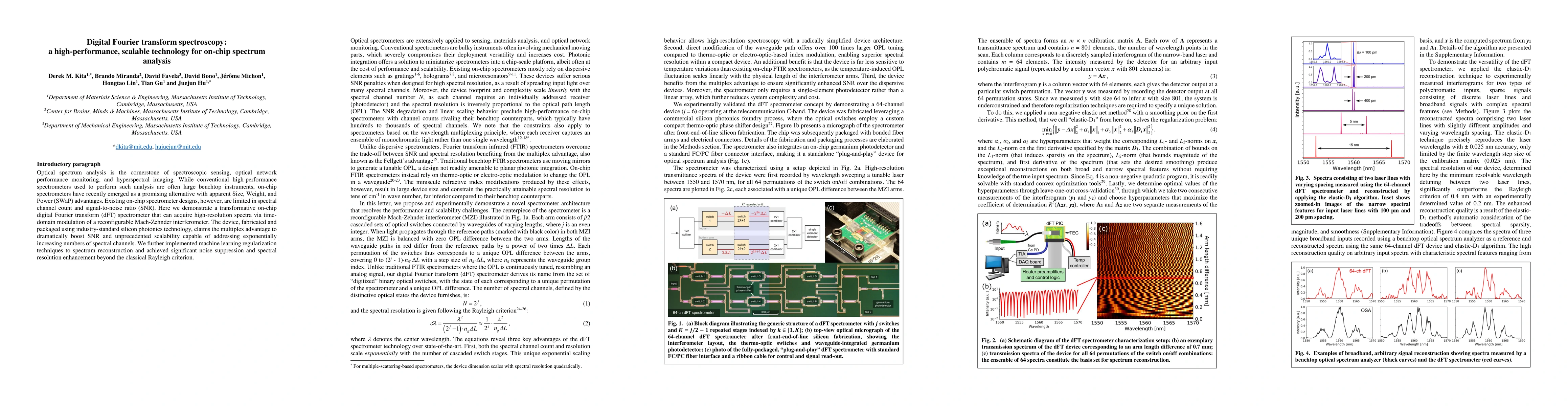 This paper presents a high-performance, scalable on-chip digital Fourier transform spectrometer using silicon photonics for optical spectrum analysis, achieving high signal-to-noise ratio and scalability through time-domain modulation and machine learning techniques.