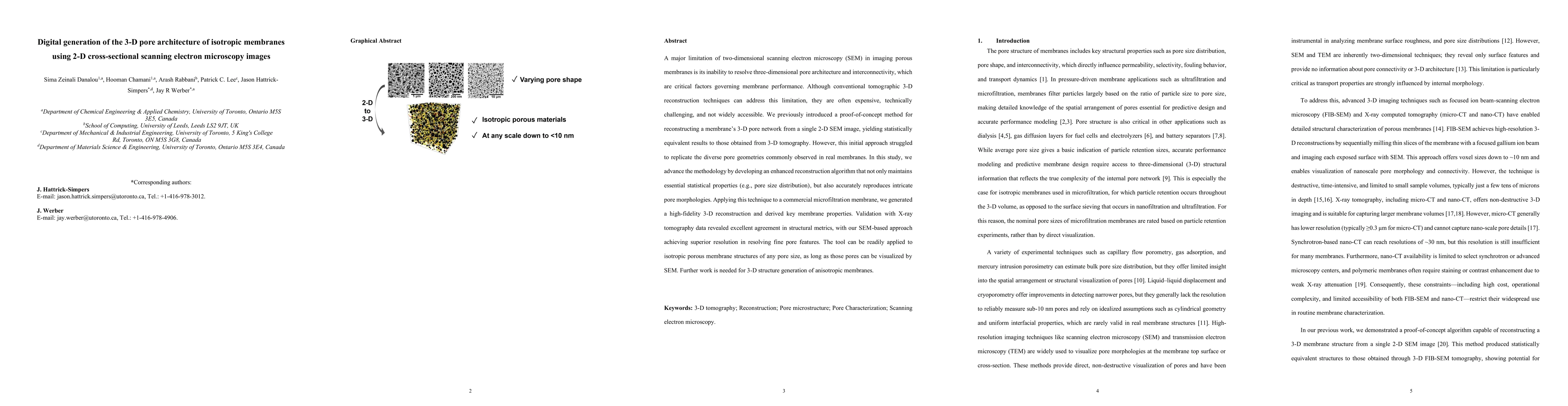 A major limitation of two-dimensional scanning electron microscopy (SEM) in imaging porous membranes is its inability to resolve three-dimensional pore architecture and interconnectivity, which are critical factors governing membrane performance. Although conventional tomographic 3-D reconstruction techniques can address this limitation, they are often expensive, technically challenging, and not widely accessible. We previously introduced a proof-of-concept method for reconstructing a membrane's 3-D pore network from a single 2-D SEM image, yielding statistically equivalent results to those obtained from 3-D tomography. However, this initial approach struggled to replicate the diverse pore geometries commonly observed in real membranes. In this study, we advance the methodology by developing an enhanced reconstruction algorithm that not only maintains essential statistical properties (e.g., pore size distribution), but also accurately reproduces intricate pore morphologies. Applying this technique to a commercial microfiltration membrane, we generated a high-fidelity 3-D reconstruction and derived key membrane properties. Validation with X-ray tomography data revealed excellent agreement in structural metrics, with our SEM-based approach achieving superior resolution in resolving fine pore features. The tool can be readily applied to isotropic porous membrane structures of any pore size, as long as those pores can be visualized by SEM. Further work is needed for 3-D structure generation of anisotropic membranes.