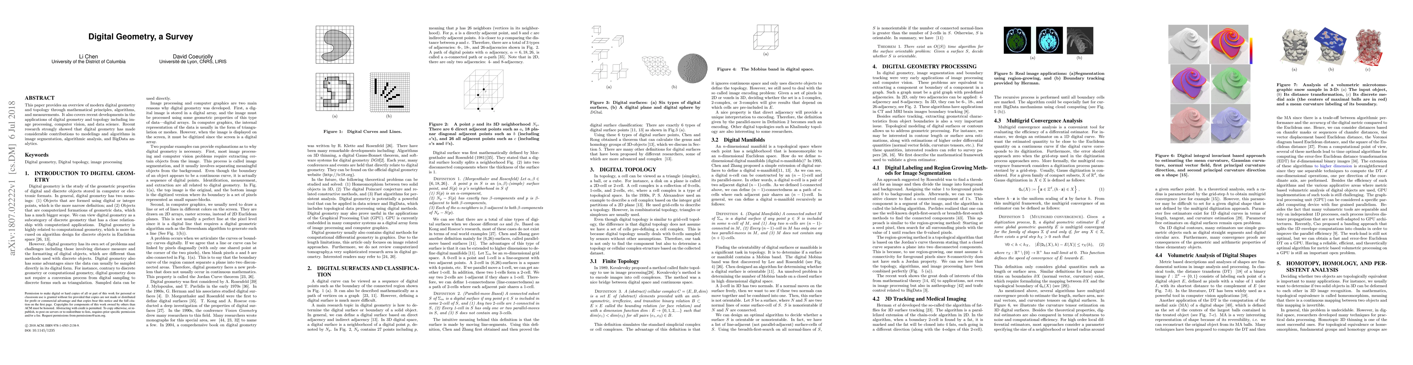 This paper provides an overview of modern digital geometry and topology through mathematical principles, algorithms, and measurements. It also covers recent developments in the applications of digital geometry and topology including image processing, computer vision, and data science. Recent research strongly showed that digital geometry has made considerable contributions to modelings and algorithms in image segmentation, algorithmic analysis, and BigData analytics.