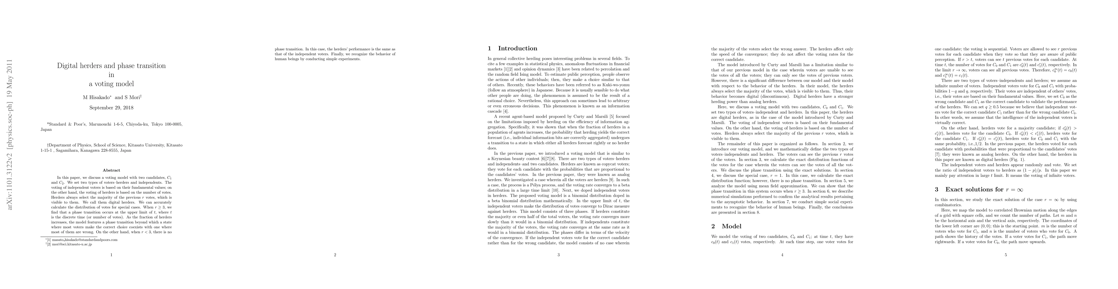 This paper explores a voting model with herders and independent voters, where herders follow the majority of recent votes. It finds that when herders' influence is significant (r>=3), a phase transition occurs where correct voting becomes possible alongside incorrect voting, unlike when r<3.
