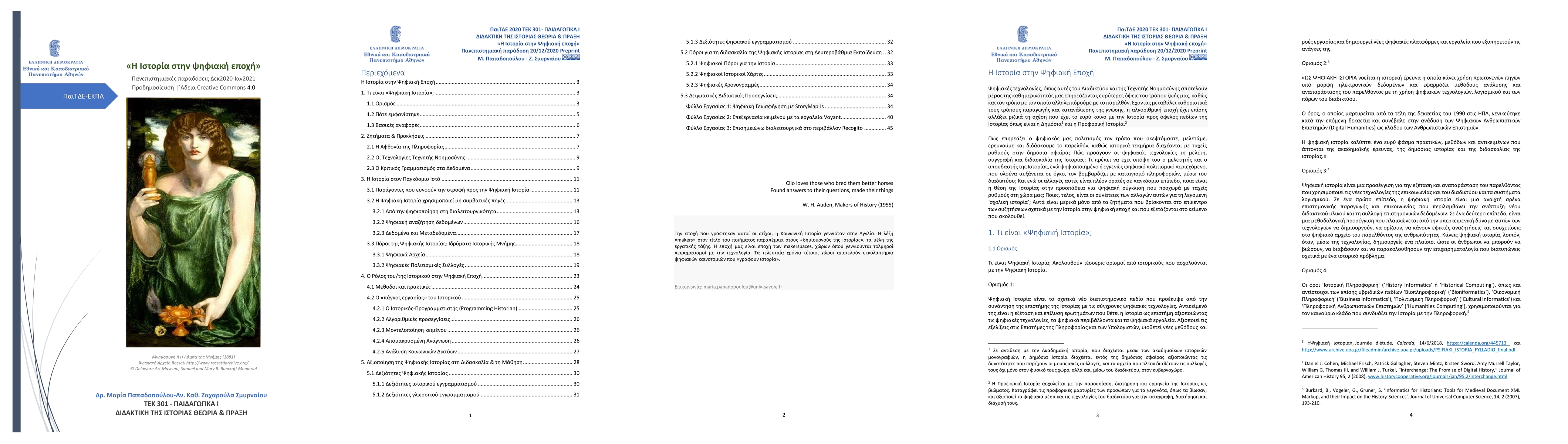 Digital technologies, such as the Internet and Artificial Intelligence, are part of our daily lives, influencing broader aspects of our way of life, as well as the way we interact with the past. Having dramatically changed the ways in which knowledge is produced and consumed, the algorithmic age has also radically changed the relationship that the general public has with History. Fields of History such as Public and Oral History have particularly benefitted from the rise of digital culture. How does our digital culture affect the way we think, study, research and teach the past, as historical evidence spreads rapidly in the public sphere? How do digital technologies promote the study, writing and teaching of History? What should historians, students of history and pre-service history teachers be critically aware of, when swarmed with digitized or born-digital content, constantly growing on the Internet? And while these changes are now visible globally, how is the discipline of History situated within the digital transformation rapidly advancing in Greece? Finally, what are the consequences of these changes for History as a subject taught at Greek secondary schools? These are some of the issues raised in the text that follows, which is part of the course materials of the undergraduate course offered during winter semester 2020-2021 at the School University of Athens, School of Philosophy, Pedagogy, Psychology. Course Title: 'Pedagogics of History: Theory and Practice', Academic Institution: School of Philosophy-Pedagogy-Psychology, University of Athens.