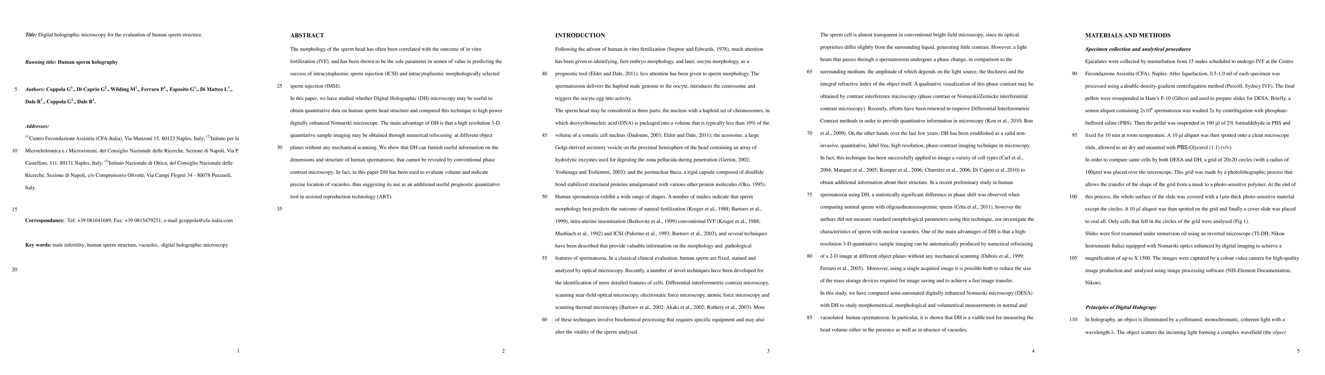 This paper investigates the utility of Digital Holographic (DH) microscopy for evaluating human sperm head structure, demonstrating its potential to provide quantitative 3-D imaging and detailed information on sperm dimensions and vacuole locations compared to traditional microscopy, offering a new tool for assisted reproduction technology.