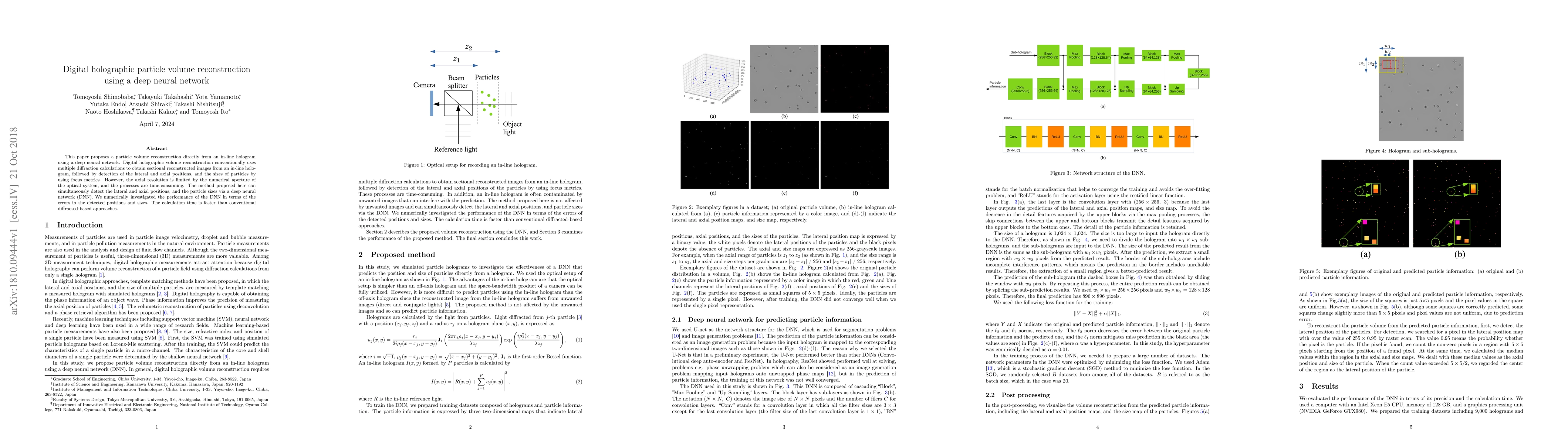 This paper introduces a deep neural network for reconstructing particle volumes directly from in-line holograms, bypassing conventional time-consuming diffraction calculations. The proposed method simultaneously detects particle positions and sizes, achieving faster computation and potentially higher axial resolution.