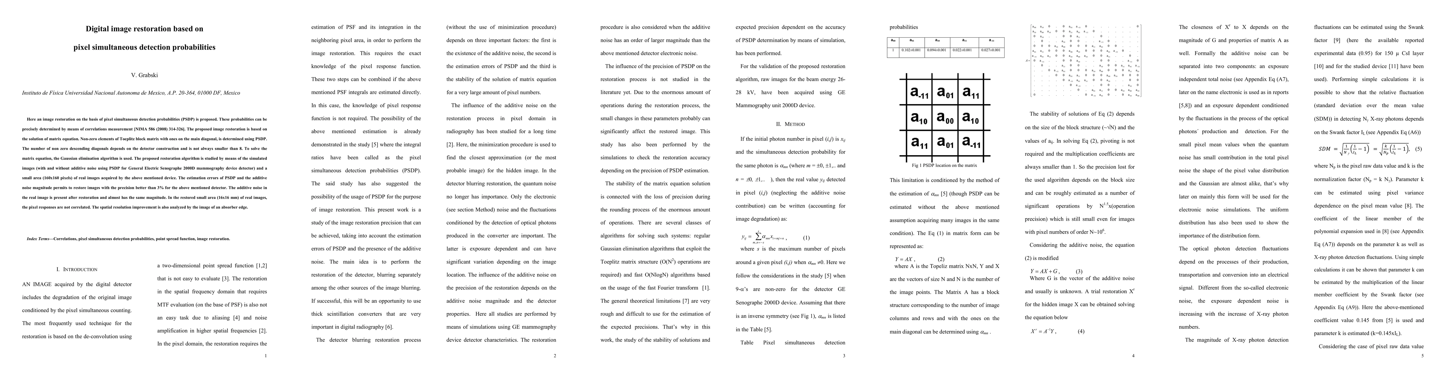 This paper proposes an image restoration method using pixel simultaneous detection probabilities (PSDP) to determine non-zero elements in a Toeplitz block matrix, solved via Gaussian elimination. The method is tested on simulated and real images from a mammography device, achieving restoration precision better than 3%.