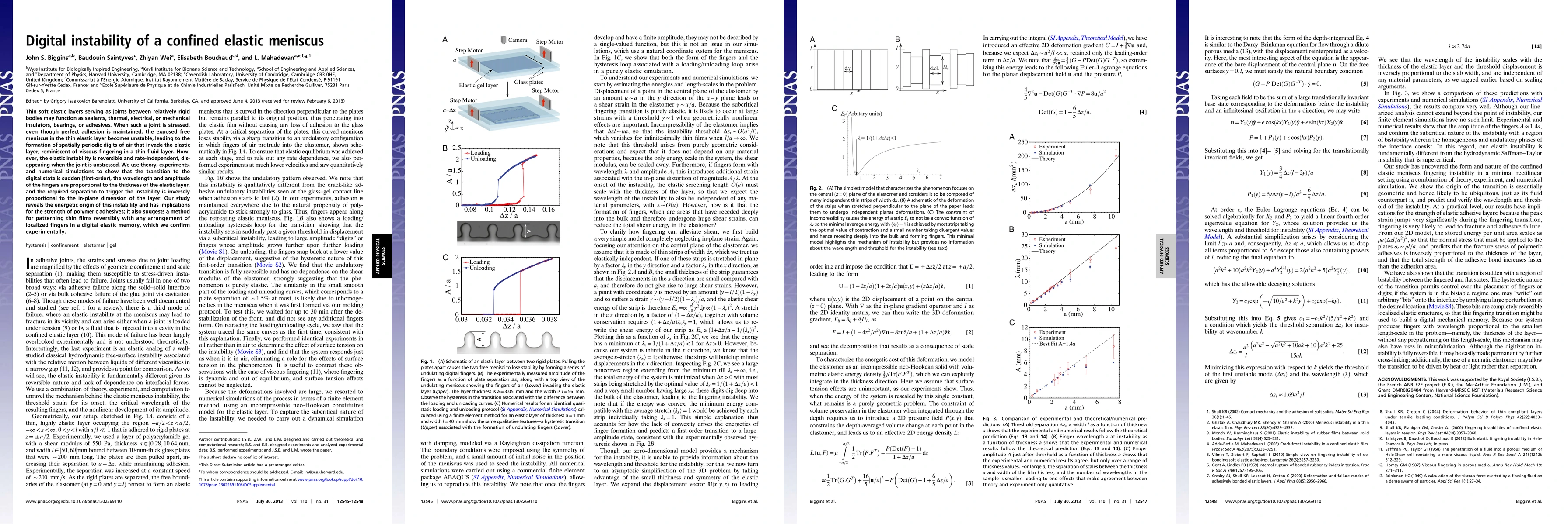 Thin soft elastic layers serving as joints between relatively rigid bodies may function as sealants, thermal, electrical, or mechanical insulators, bearings, or adhesives. When such a joint is stressed, even though perfect adhesion is maintained, the exposed free meniscus in the thin elastic layer becomes unstable, leading to the formation of spatially periodic digits of air that invade the elastic layer, reminiscent of viscous fingering in a thin fluid layer. How- ever, the elastic instability is reversible and rate-independent, dis- appearing when the joint is unstressed. We use theory, experiments, and numerical simulations to show that the transition to the digital state is sudden (first-order), the wavelength and amplitude of the fingers are proportional to the thickness of the elastic layer, and the required separation to trigger the instability is inversely proportional to the in-plane dimension of the layer. Our study reveals the energetic origin of this instability and has implications for the strength of polymeric adhesives; it also suggests a method for patterning thin films reversibly with any arrangement of localized fingers in a digital elastic memory, which we confirm experimentally.