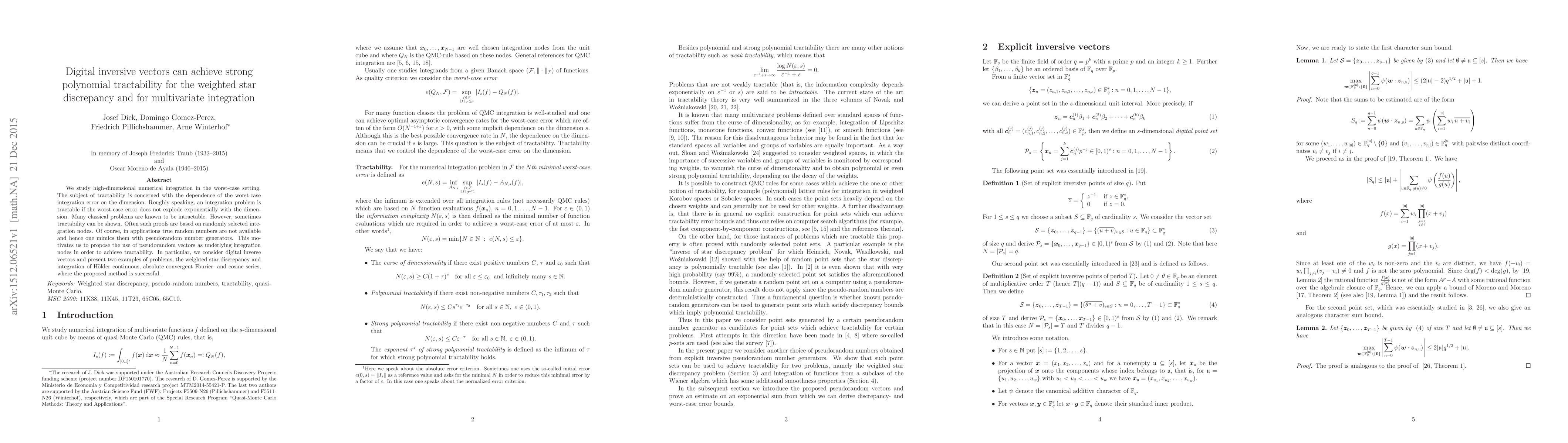 This paper investigates high-dimensional numerical integration, focusing on the tractability of integration problems where errors do not exponentially increase with dimension. The authors propose using digital inversive vectors as pseudorandom nodes to achieve strong polynomial tractability for the weighted star discrepancy and multivariate integration of H\"older continuous functions.