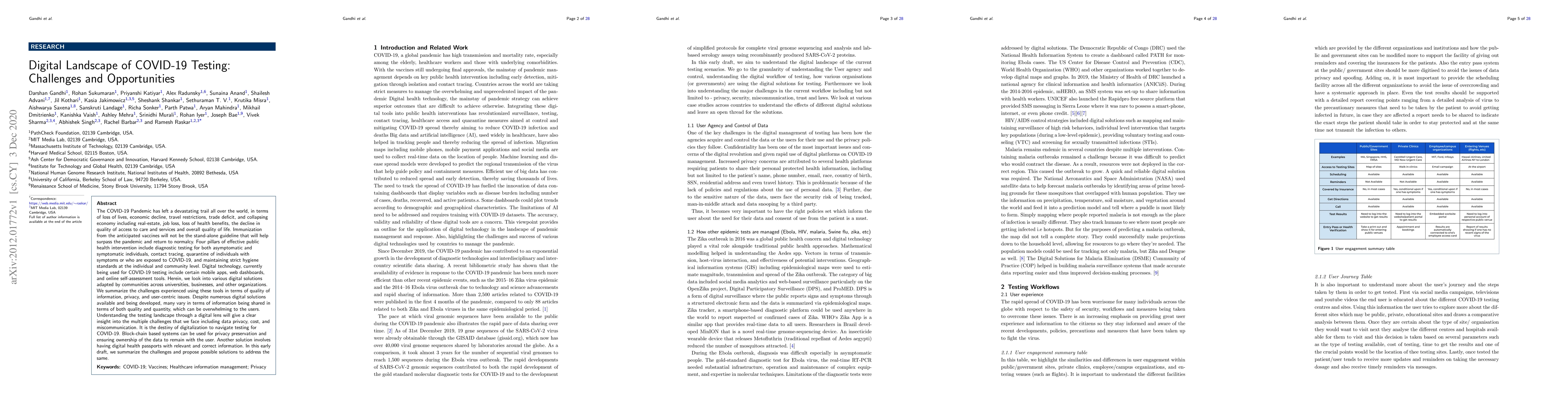 The COVID-19 Pandemic has left a devastating trail all over the world, in terms of loss of lives, economic decline, travel restrictions, trade deficit, and collapsing economy including real-estate, job loss, loss of health benefits, the decline in quality of access to care and services and overall quality of life. Immunization from the anticipated vaccines will not be the stand-alone guideline that will help surpass the pandemic and return to normalcy. Four pillars of effective public health intervention include diagnostic testing for both asymptomatic and symptomatic individuals, contact tracing, quarantine of individuals with symptoms or who are exposed to COVID-19, and maintaining strict hygiene standards at the individual and community level. Digital technology, currently being used for COVID-19 testing include certain mobile apps, web dashboards, and online self-assessment tools. Herein, we look into various digital solutions adapted by communities across universities, businesses, and other organizations. We summarize the challenges experienced using these tools in terms of quality of information, privacy, and user-centric issues. Despite numerous digital solutions available and being developed, many vary in terms of information being shared in terms of both quality and quantity, which can be overwhelming to the users. Understanding the testing landscape through a digital lens will give a clear insight into the multiple challenges that we face including data privacy, cost, and miscommunication. It is the destiny of digitalization to navigate testing for COVID-19. Block-chain based systems can be used for privacy preservation and ensuring ownership of the data to remain with the user. Another solution involves having digital health passports with relevant and correct information. In this early draft, we summarize the challenges and propose possible solutions to address the same.