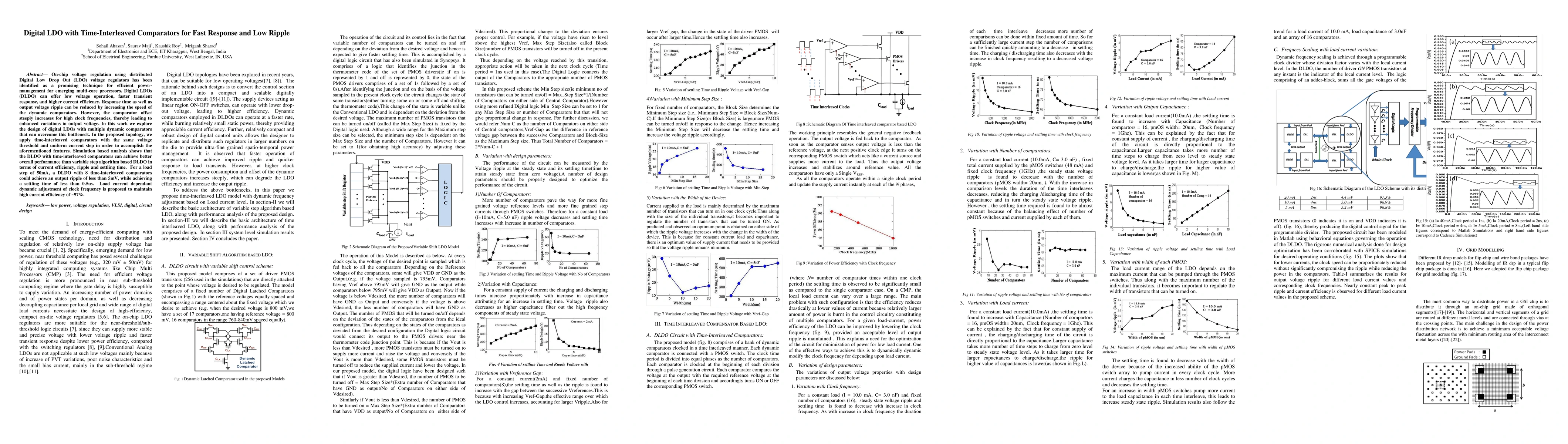 This paper proposes a digital LDO with time-interleaved comparators to achieve fast response and low output ripple for efficient power management in multi-core processors. The design achieves improved current efficiency, reduced ripple, and faster settling time, with a 50mA load step showing less than 5mV ripple and 0.5us settling time.