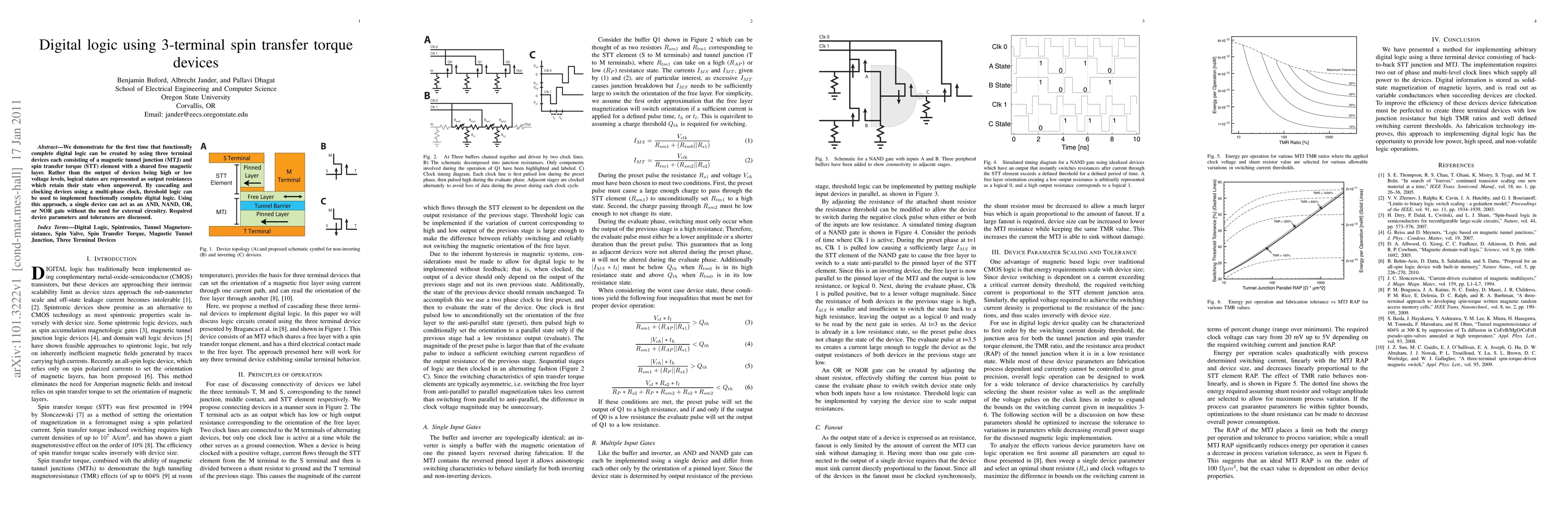 This paper presents a novel digital logic system utilizing three-terminal spin transfer torque devices combining magnetic tunnel junctions and spin transfer torque elements. It demonstrates functionally complete logic through resistance-based states that retain their values without power, enabling AND, NAND, OR, and NOR gates with a multi-phase clock and threshold logic.