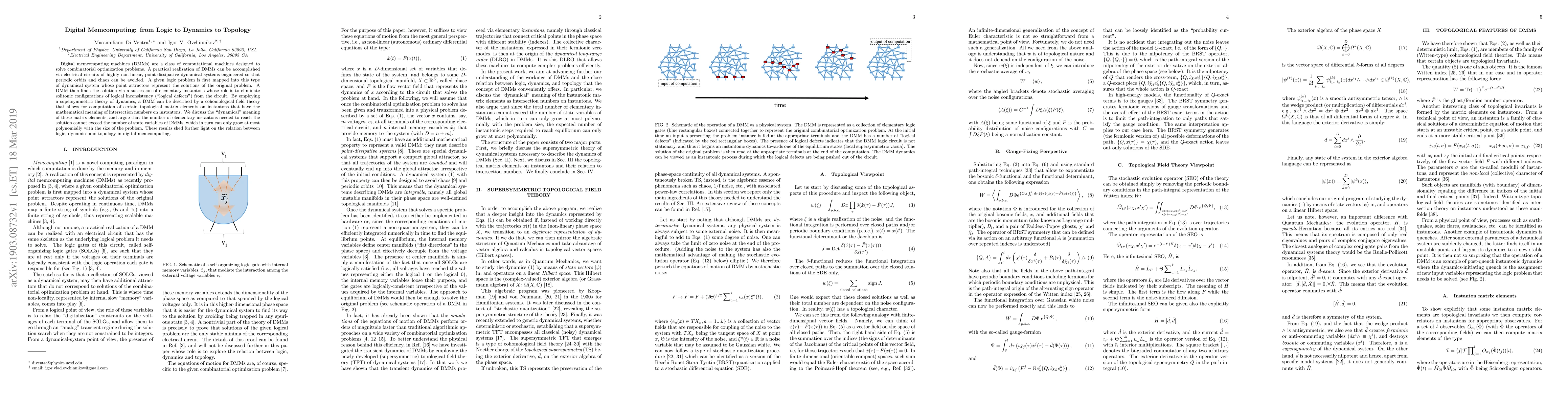 This paper explores digital memcomputing machines (DMMs) for solving combinatorial optimization problems through engineered non-linear dynamical systems. It demonstrates how DMMs use elementary instantons to eliminate logical inconsistencies, leveraging a cohomological field theory to compute topological matrix elements, thereby revealing a polynomial growth in complexity with problem size.