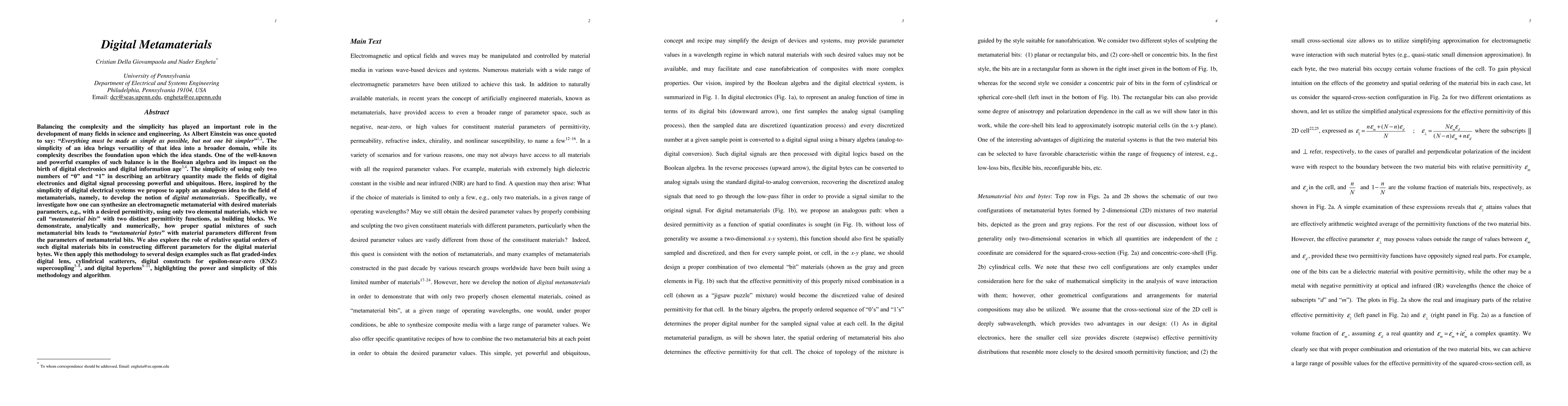 Balancing the complexity and the simplicity has played an important role in the development of many fields in science and engineering. As Albert Einstein was once quoted to say: 'Everything must be made as simple as possible, but not one bit simpler'. The simplicity of an idea brings versatility of that idea into a broader domain, while its complexity describes the foundation upon which the idea stands. One of the well-known and powerful examples of such balance is in the Boolean algebra and its impact on the birth of digital electronics and digital information age. The simplicity of using only two numbers of '0' and '1' in describing an arbitrary quantity made the fields of digital electronics and digital signal processing powerful and ubiquitous. Here, inspired by the simplicity of digital electrical systems we propose to apply an analogous idea to the field of metamaterials, namely, to develop the notion of digital metamaterials. Specifically, we investigate how one can synthesize an electromagnetic metamaterial with desired materials parameters, e.g., with a desired permittivity, using only two elemental materials, which we call 'metamaterial bits' with two distinct permittivity functions, as building blocks. We demonstrate, analytically and numerically, how proper spatial mixtures of such metamaterial bits leads to 'metamaterial bytes' with material parameters different from the parameters of metamaterial bits. We also explore the role of relative spatial orders of such digital materials bits in constructing different parameters for the digital material bytes. We then apply this methodology to several design examples such as flat graded-index digital lens, cylindrical scatterers, digital constructs for epsilon-near-zero (ENZ) supercoupling, and digital hyperlens, highlighting the power and simplicity of this methodology and algorithm.