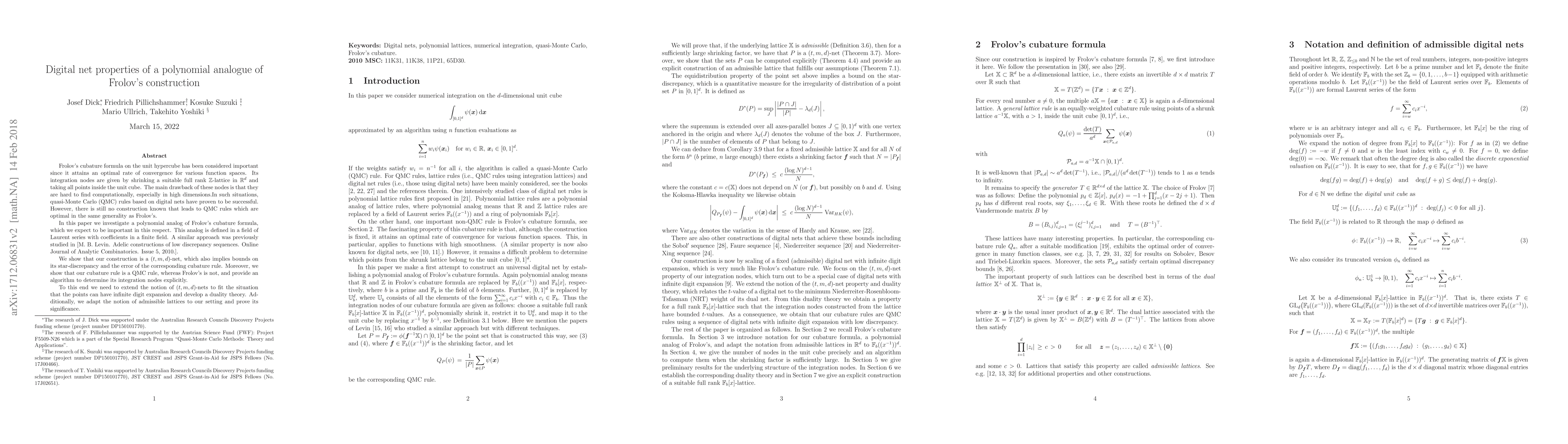 This paper explores a polynomial analogue of Frolov's cubature formula, demonstrating its effectiveness as a $(t,m,d)$-net and quasi-Monte Carlo rule. It extends the notion of $(t,m,d)$-nets for infinite digit expansions and develops a duality theory to determine integration nodes explicitly.