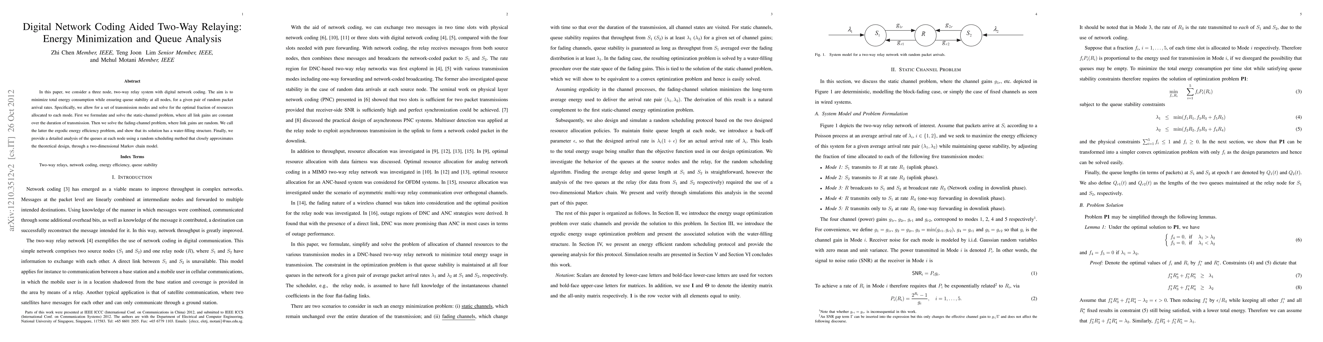 In this paper, we consider a three node, two-way relay system with digital network coding over static channels where all link gains are assumed to be constant during transmission. The aim is to minimize total energy consumption while ensuring queue stability at all nodes, for a given pair of random packet arrival rates. Specifically, we allow for a set of transmission modes and solve for the optimal fraction of resources allocated to each mode, including multiaccess uplink transmission mode and network coding broadcasting mode. In addition, for the downlink, we find the condition to determine whether superposition coding with excess data over the better link and network coded data for both users is energy efficient and the corresponding optimization is formulated and solved. To tackle the queue evolution in this network, we present a detailed analysis of the queues at each node using a random scheduling method that closely approximates the theoretical design, through a two-dimensional Markov chain model.