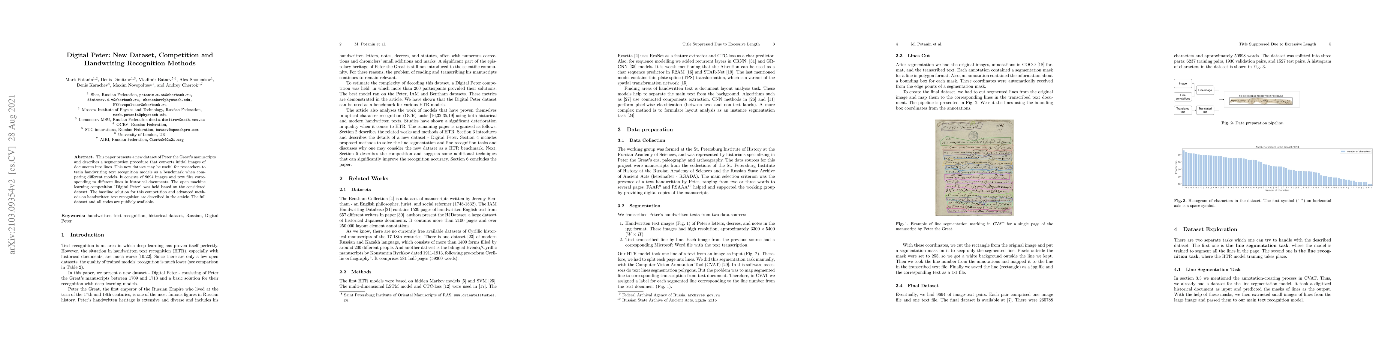 This paper presents a new dataset of Peter the Great's manuscripts and describes a segmentation procedure that converts initial images of documents into the lines. The new dataset may be useful for researchers to train handwriting text recognition models as a benchmark for comparing different models. It consists of 9 694 images and text files corresponding to lines in historical documents. The open machine learning competition Digital Peter was held based on the considered dataset. The baseline solution for this competition as well as more advanced methods on handwritten text recognition are described in the article. Full dataset and all code are publicly available.
