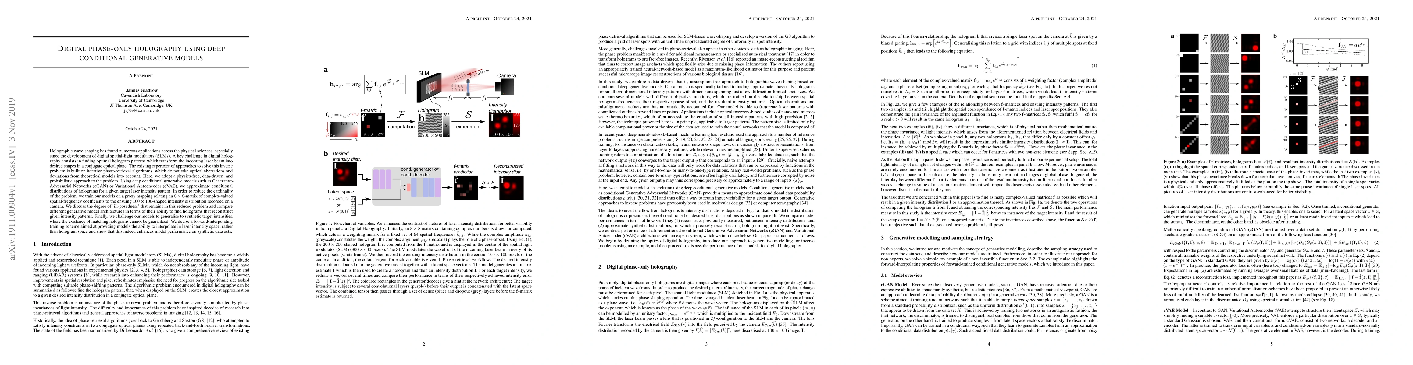 The paper introduces the use of deep conditional generative models (cGAN and cVAE) for phase-retrieval in digital holography, demonstrating their ability to approximate conditional distributions of holograms for given target laser intensity patterns.