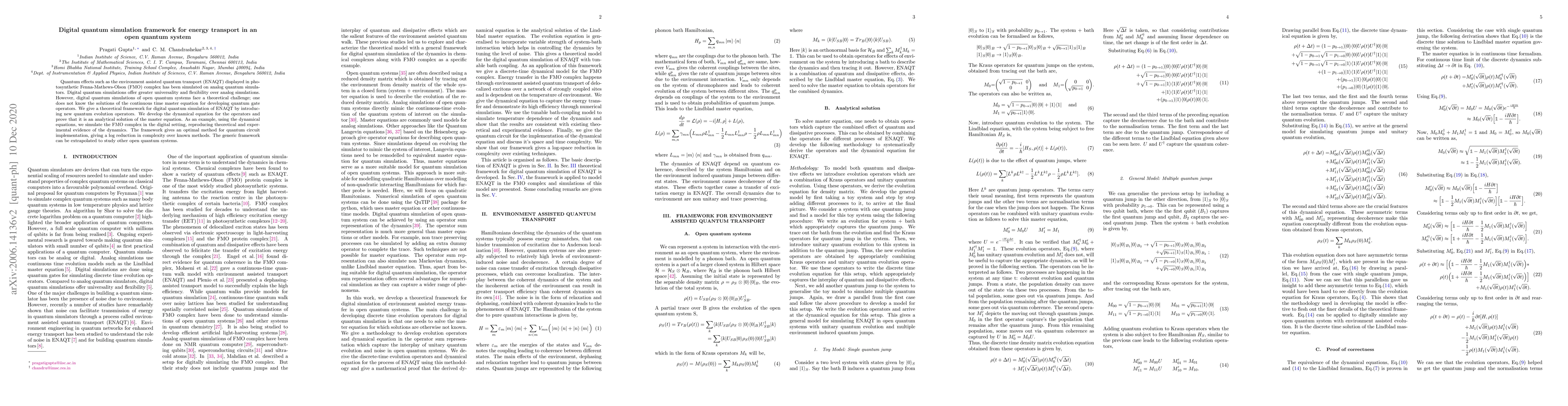 This paper presents a theoretical framework for digital quantum simulations of environment-assisted quantum transport in open quantum systems, specifically addressing the photosynthetic Fenna-Mathews-Olson complex. The authors introduce new quantum evolution operators and develop a dynamical equation that provides an analytical solution to the continuous time master equation, achieving a logarithmic reduction in complexity compared to existing methods.