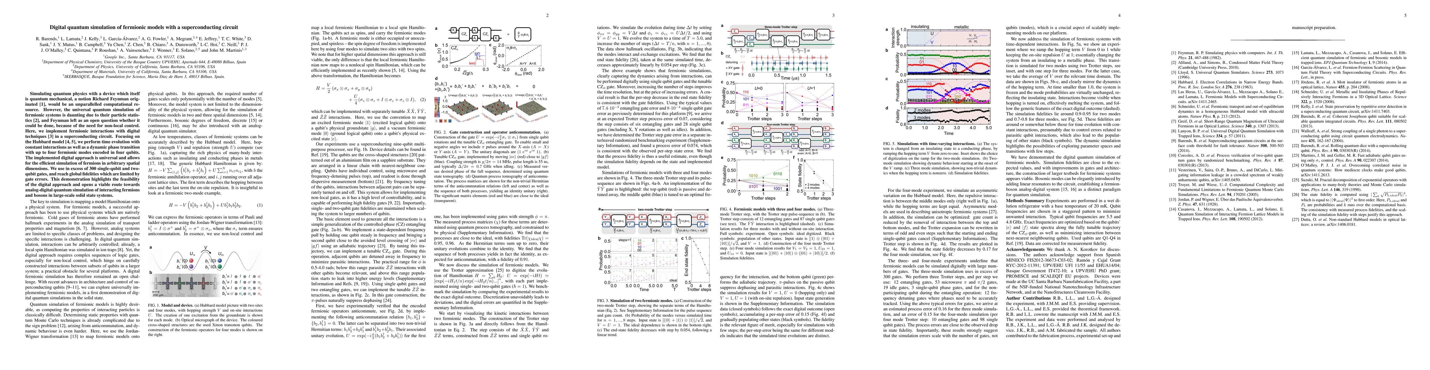 This paper demonstrates a digital quantum simulation of fermionic models using a superconducting circuit, successfully implementing interactions in the Hubbard model with up to four qubits. The approach shows high fidelity and opens a pathway for simulating interacting fermions and bosons in large-scale systems.
