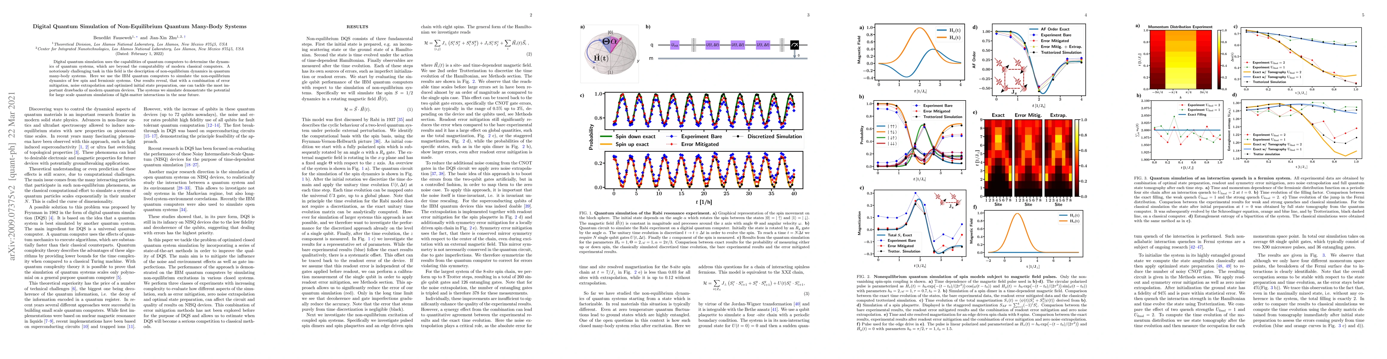 Digital quantum simulation uses the capabilities of quantum computers to determine the dynamics of quantum systems, which are beyond the computability of modern classical computers. A notoriously challenging task in this field is the description of non-equilibrium dynamics in quantum many-body systems. Here we use the IBM quantum computers to simulate the non-equilibrium dynamics of few spin and fermionic systems. Our results reveal, that with a combination of error mitigation, noise extrapolation and optimized initial state preparation, one can tackle the most important drawbacks of modern quantum devices. The systems we simulate demonstrate the potential for large scale quantum simulations of light-matter interactions in the near future.