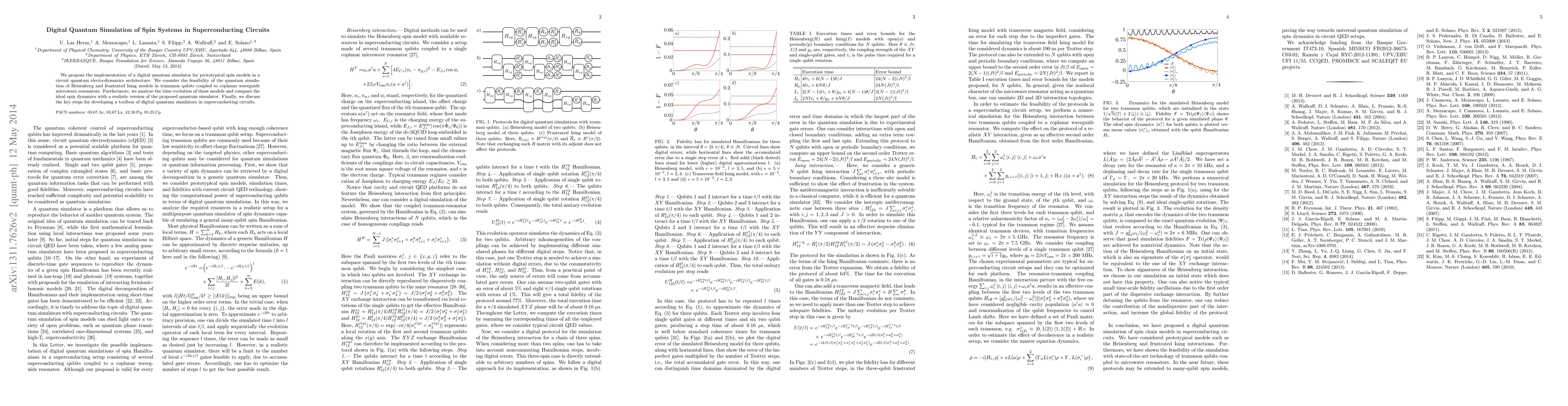 This paper proposes a digital quantum simulator for simulating spin systems in superconducting circuits, specifically targeting Heisenberg and frustrated Ising models using transmon qubits. The study compares ideal spin dynamics with realistic simulations and outlines the essential steps for developing digital quantum simulation tools.