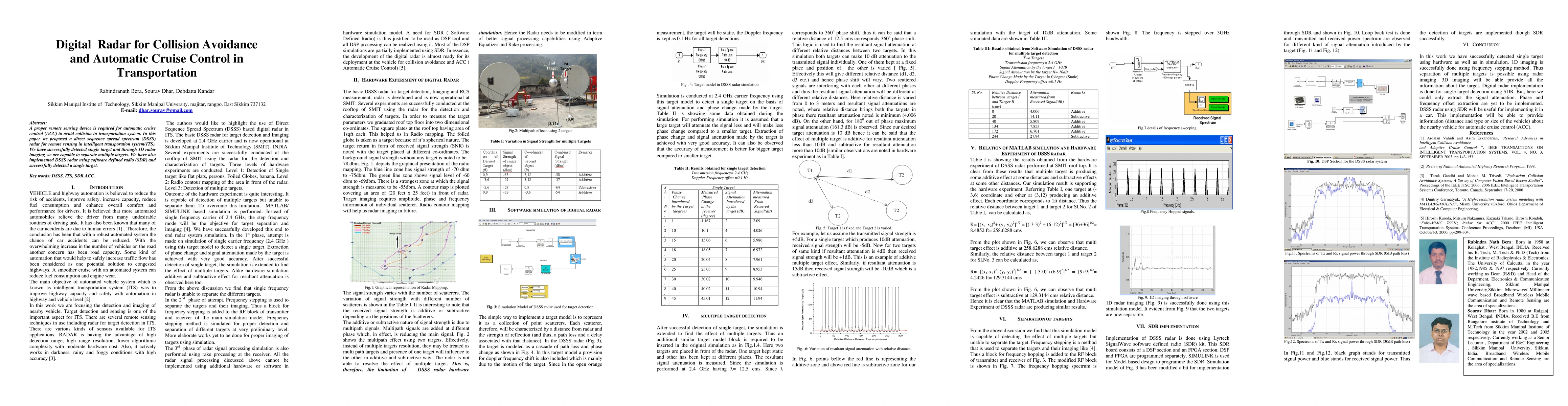 A proper remote sensing device is required for automatic cruise control (ACC) to avoid collision in transportation system. In this paper we proposed a direct sequence spread spectrum (DSSS) radar for remote sensing in intelligent transporation system(ITS). We have successfully detected single target and through 1D radar imaging we are capable to separate multiple targets. We have also implemented DSSS radar using software defined radio (SDR) and successfully detected a single target.